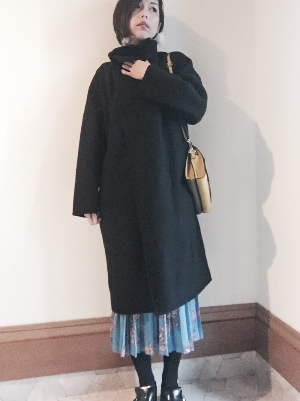 ブラック系のチェスターコートを着用したレディースの冬コーディネートの1枚目の写真