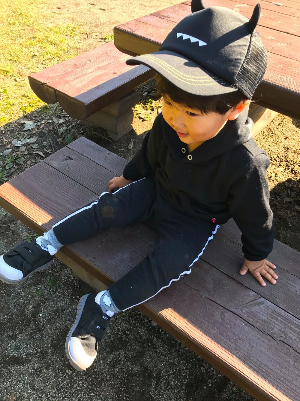 今日の公園はblack code 汚れるので思いっきり遊ばせる時は 黒に限りますね😏🤟 すでに転びまくってパンツが 泥だらけです😂😂 ツノのあるキャップは 一目でこれはおはるの為の 帽子だ!!と即決でした😊💓w