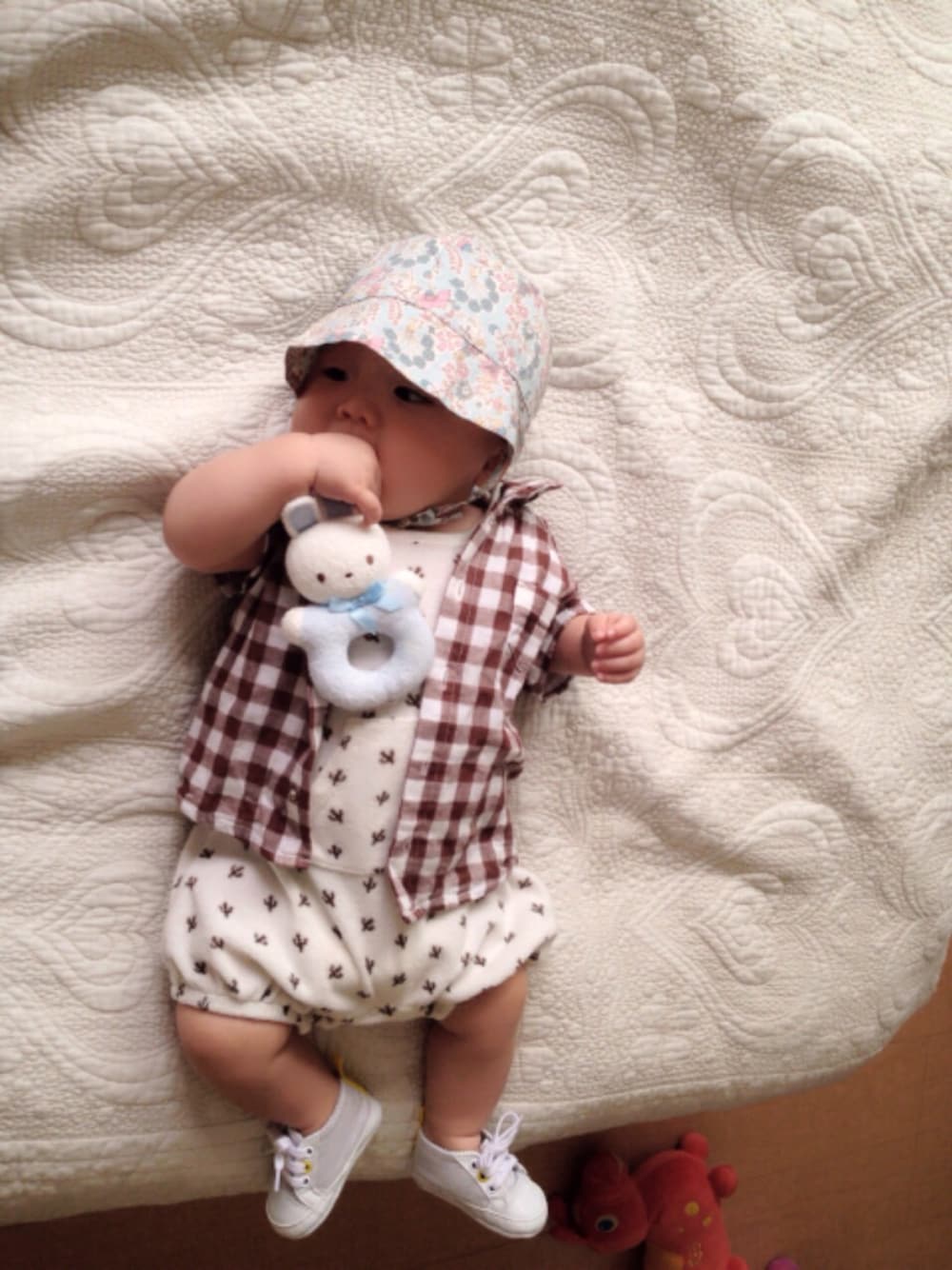 今日は3回目の予防接種だったので、脱がせやすいロンパースで🎵 帽子とシャツは、帽子と同じ柄のパンツと3点セット190円でヤフオクで落札したのを着せてみたんだけど、ナチュラルな感じで生地も柔らかいからこれから活躍しそう(≧∇≦)