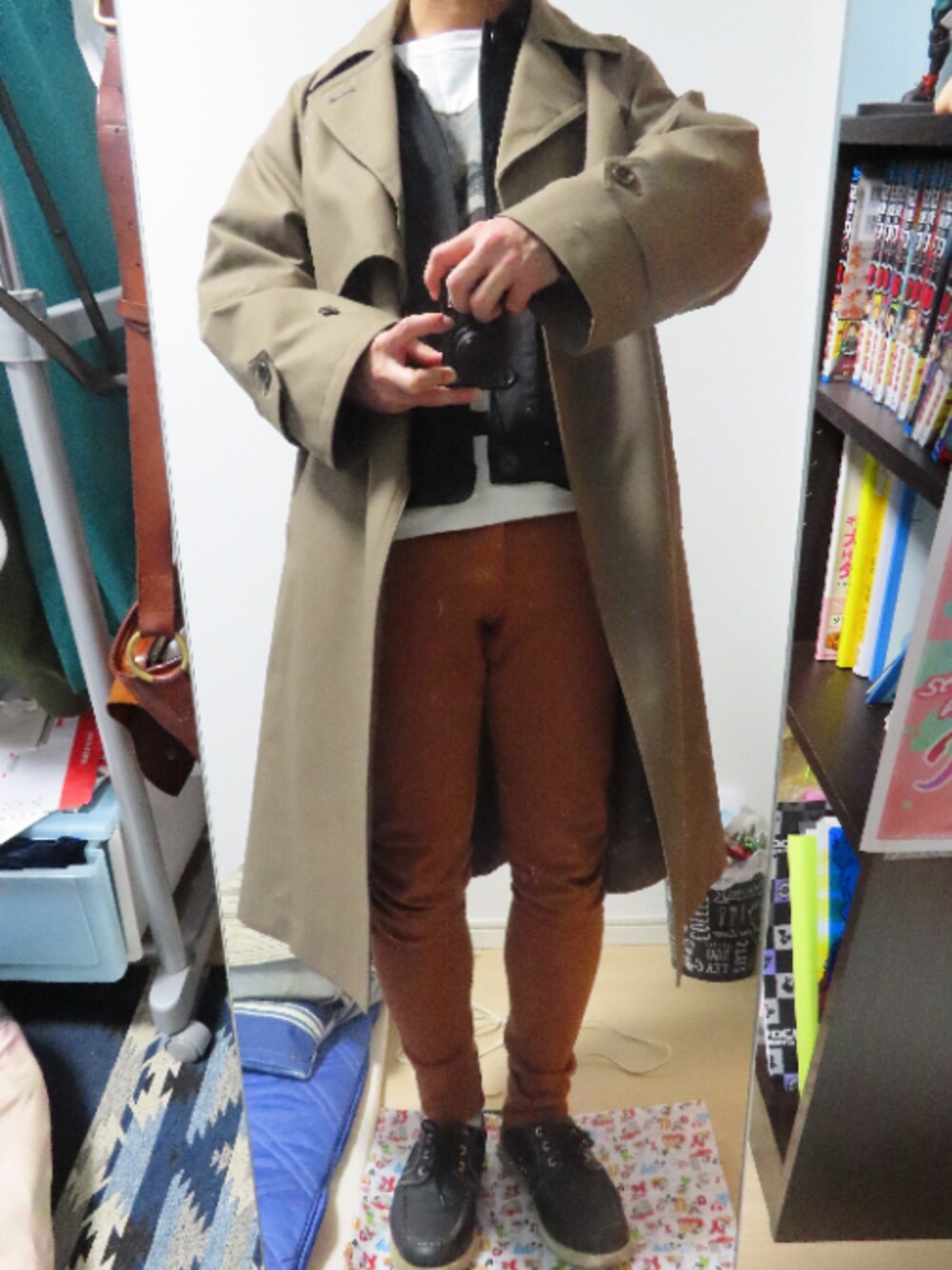今回のコーデです LIDNMで買ったトレンチコートの着こなしを模索中です とりあえずサンドイッチ効果で靴と中の服を黒、トレンチコートとパンツを似た色にあわせました コート Mサイズ アウター Mサイズ ニット Lサイズ パンツ 27インチ