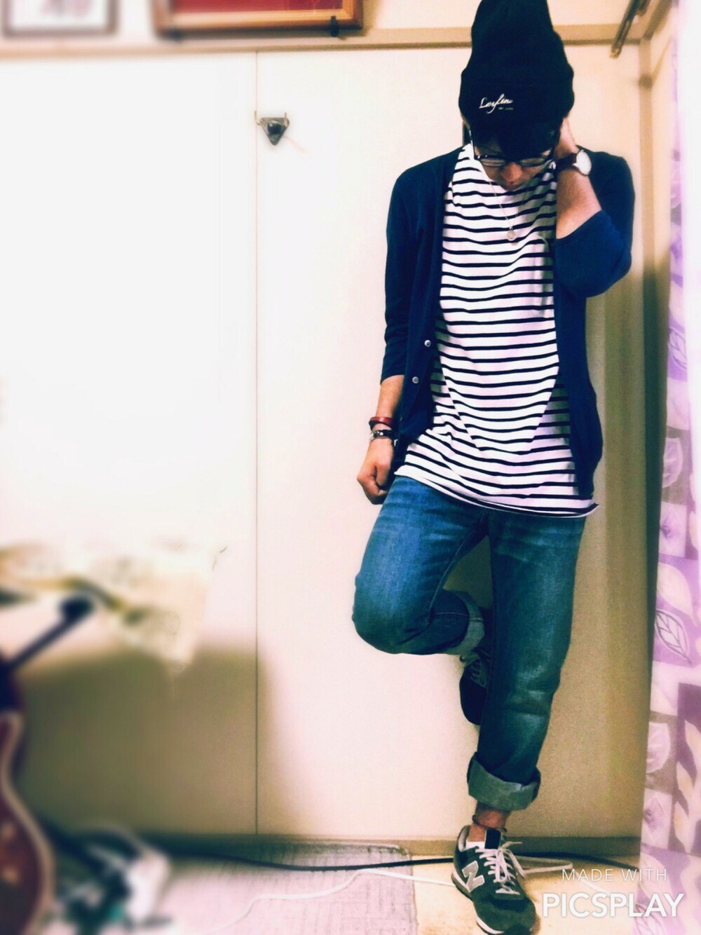 ロング丈のボーダーTにHAREのカーディガンでゆったり目のコーデ gramichiのパンツは動きやすくて楽です^o^