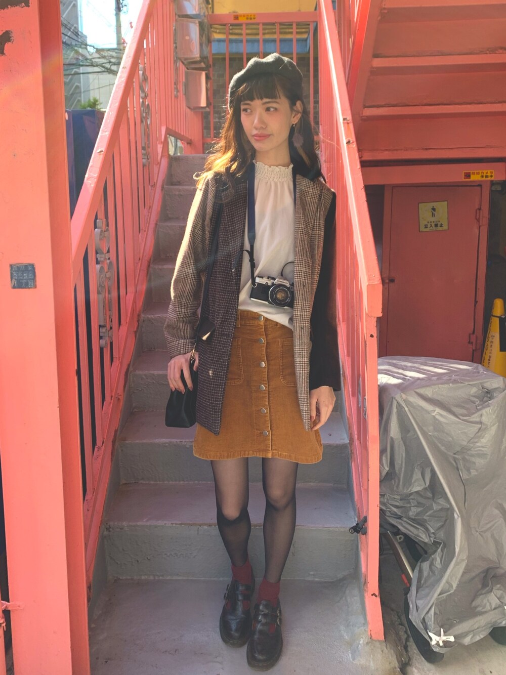 秋のブラウン系コーデ🍂 ピンク色の階段可愛かった。