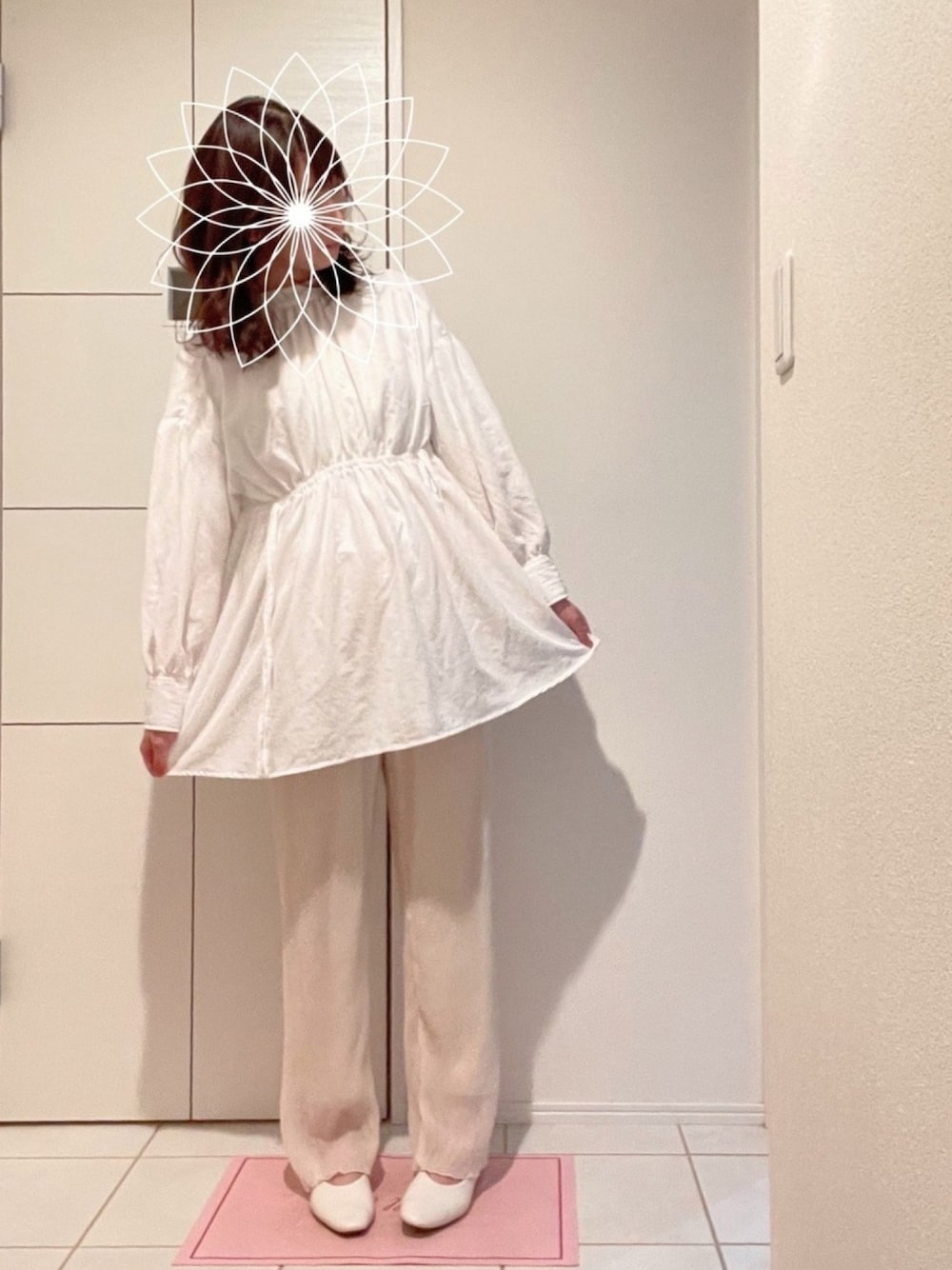 オールホワイトコーデ このパンツは昨日入荷したばかりの新作とのことで、早速着てみましたが涼しげな生地感で可愛いです◎