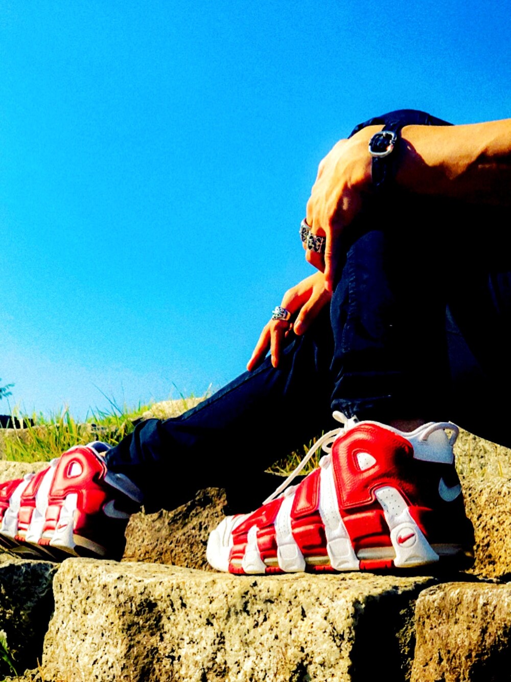 としや のスニーカー「モアアップテンポ ジムレッド」を使ったコーディネート