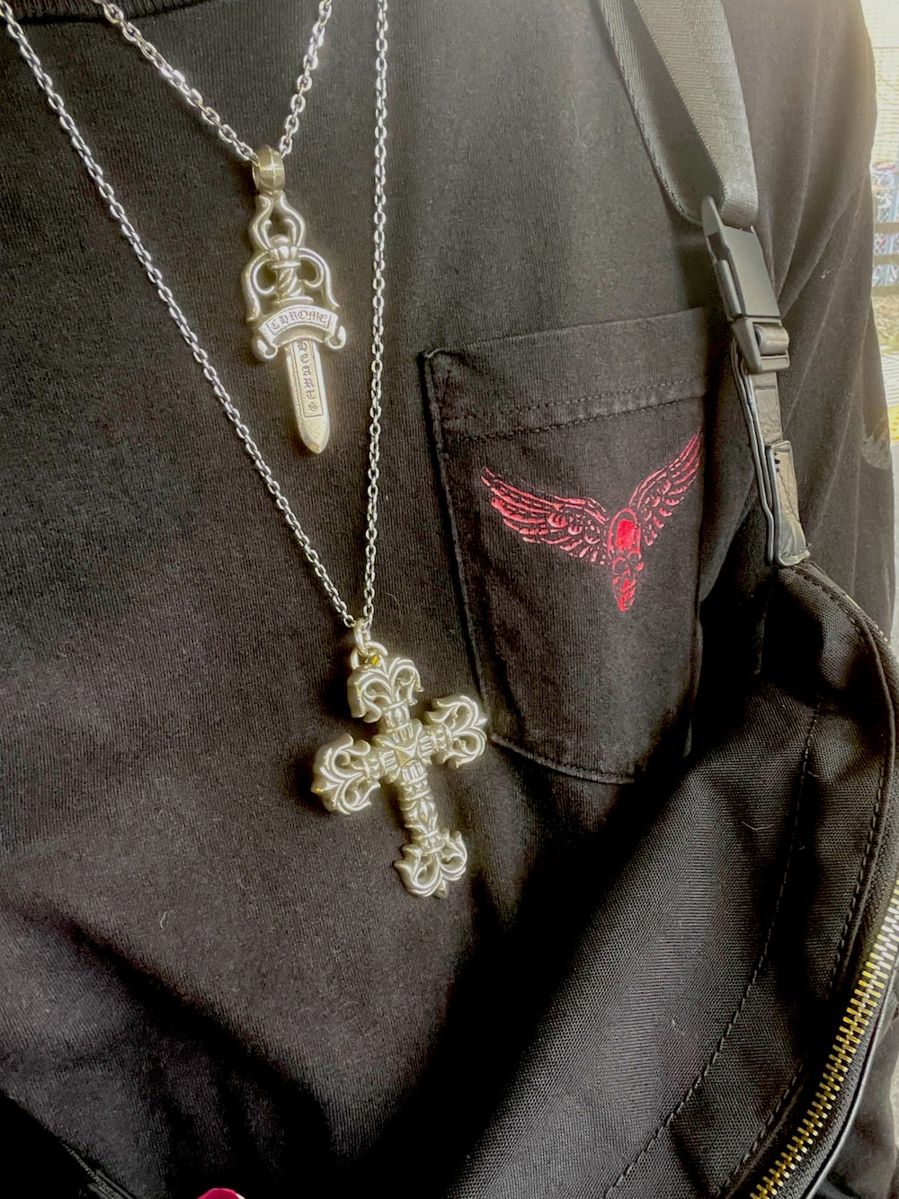 馴染みのお店でフォティのロンTを見つけて購入。 いい感じのヴィンテージ感がでる昔のボディが好き。 あとはラージダガーとスモールフィリグリークロスを合わせたデカすぎコーデ。 これくらいのインパクトあるネックレスはなかなかないよね