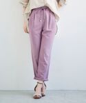 【ツイストヘムイージーテーパードパンツ】 ▷普段のサイズ:S ▷着用サイズ:36 ▷サイズ感:ウエストゴムとフロントタックがあり、楽に履けるゆったりシルエットです。裾のデザインがアクセントになり、足元スッキリ履いていただけます。 ▷素材感/着心地:ポリエステル素材のサラッとしていて暑い夏に履きやすい1枚。ご自宅での手洗いも可能な万能アイテムです☺️