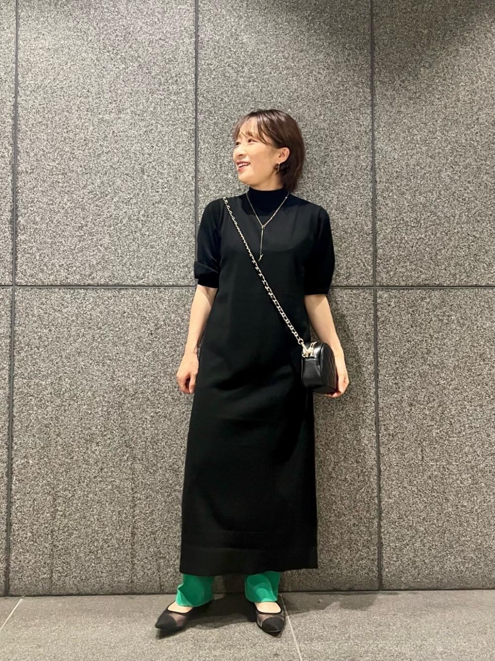 40代/152cm/骨格ストレート/普段サイズ36〜38/着用サイズ38 【バックパールニットワンピース】 サイズ感:フィットはしてないですが、ストレートの窮屈感の無いスッキリとしたサイズ感です。 素材感:少しシャリ感のある素材感で、さらっとしています。 着用感:1枚着でも良いですが、レイヤードでも着れるのでワンピースでもスタイリングの幅を広げて頂けます。