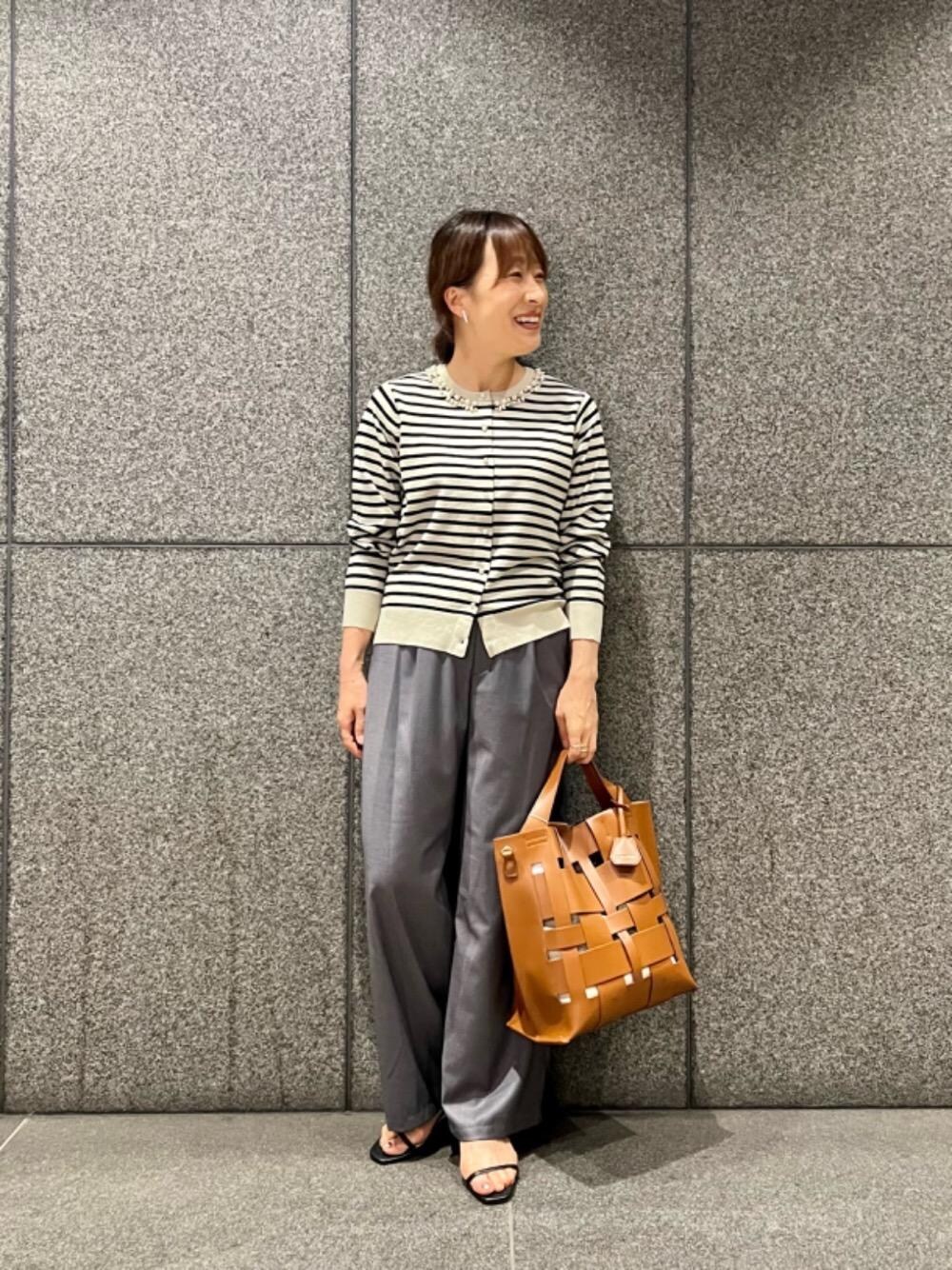 40代/152cm/骨格ストレート/普段サイズ36〜38/着用サイズ38 【パール刺繍ニットカーディガン】 サイズ感:ジャストなサイズ感ですが、カットソーやブラウス等薄手のものは中に着て頂けるサイズ感です。 素材感:アクリルやポリエステル等の滑らかな素材感で、手洗いでのお洗濯が可能です。 着用感:チクチク感が無いので直接肌にあたって不快感無く着て頂けます。 【サイドバックルベルトタックパンツ】 サイズ感:着丈がしっかりあるのでパンプスとバランス良く着て頂けます。 素材感: さらっと軽い素材で柔らかいです。 着用感:後ろウエストがゴム仕様なので楽に穿いて頂けます。