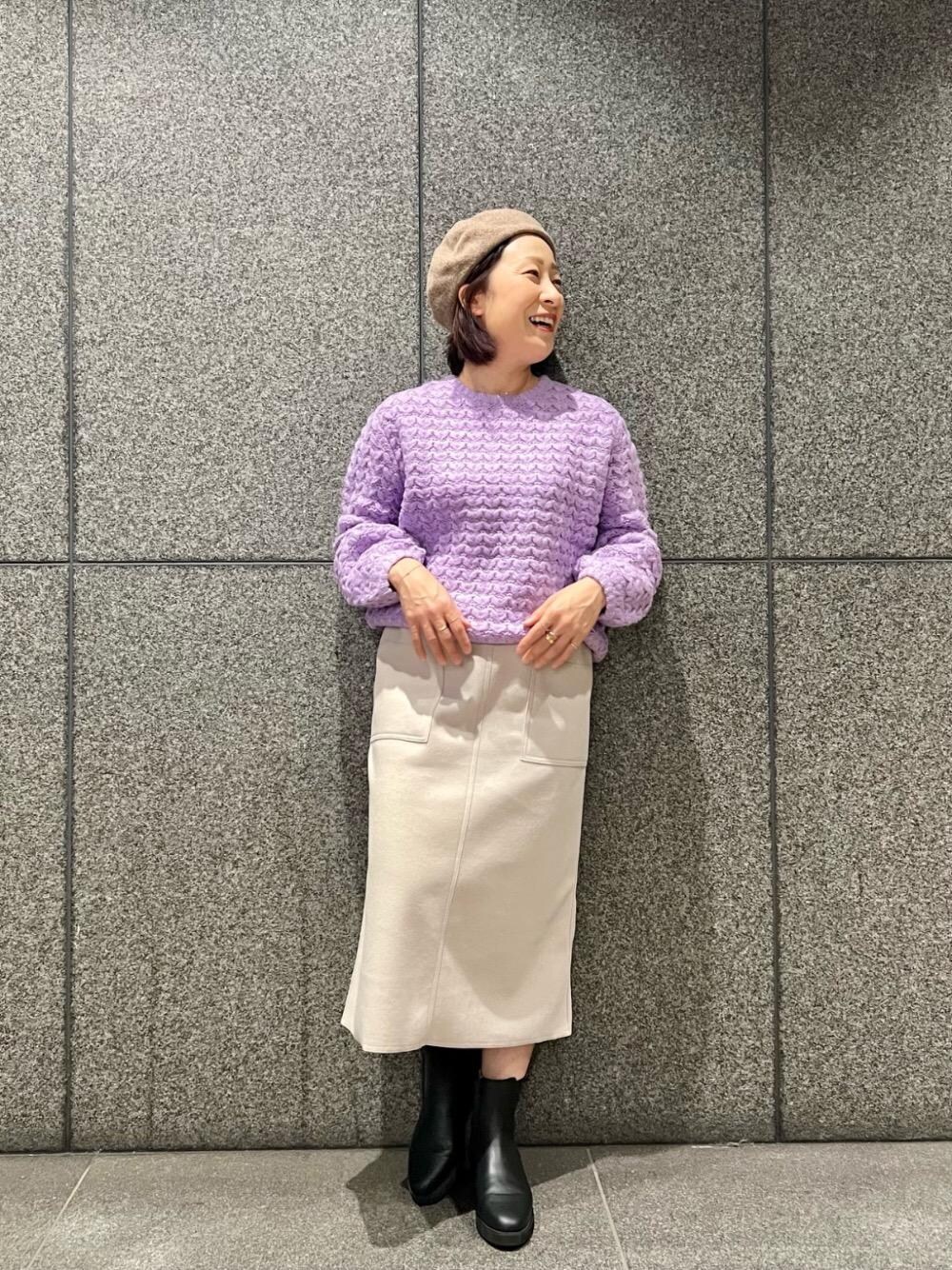 40代/152cm/骨格ストレート/普段サイズ36〜38/着用サイズ38 【ハート柄ニットプルオーバー】 サイズ感: 程よくリラックス感があります。 素材感: ざっくりとした編み目ですが、スカートなどと合わせて、綺麗めコーデにも◎ 着用感: 長過ぎない着丈で着回しやすいです。さりげないハート柄がコーデのアクセントになります。 【ジャージーメルトントラペーズスカート】着用サイズ: 36 サイズ感: 締め付け感が無く、足のラインを拾いにくいです。 素材感: 滑らかで、綺麗めコーデにも合わせやすいです。しっかりした生地で、冬でも安心して着れます。 着用感: すっきりと着れるので、ニットとバランスが取りやすいです。