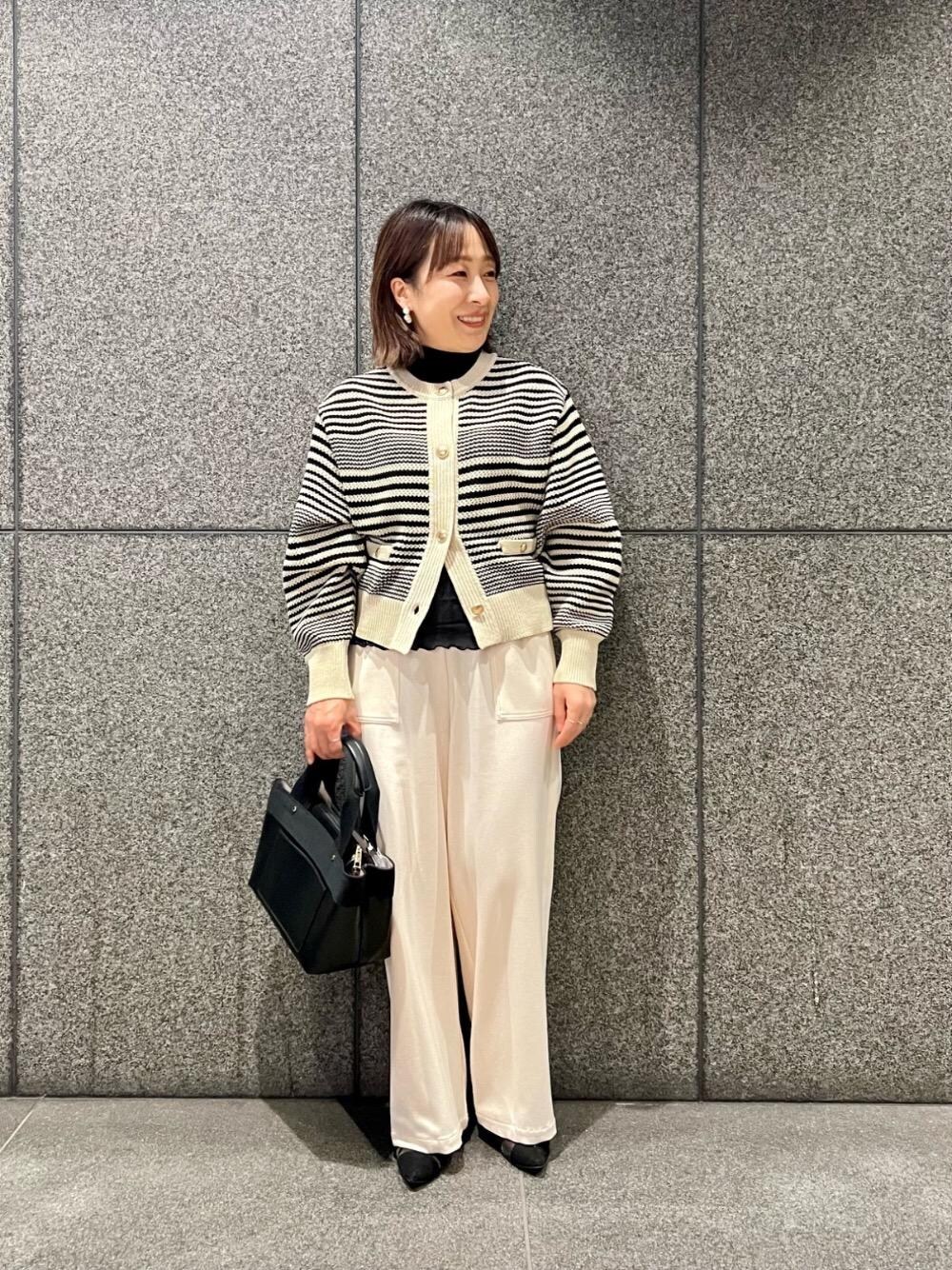 40代/152cm/骨格ストレート/普段サイズ36〜38/着用サイズ38 【柄アミニットカーディガン】 サイズ感: スッキリとしたシルエットですが、インナーを入れるゆとりはあります。 素材感: 程よい肉厚感と透け感がシーズン通して着やすく、ゴールドボタンで高級感もあります。 着用感: 着丈は短過ぎず、様々なボトムスと相性が良いです。1枚でも、カーディガンとしても使えます。 【コスミカルウォームイージーワイドパンツ】着用サイズ: 36 サイズ感: リラックス感がありながら、すっきりとしたシルエットです。 素材感: 柔らかく、内側の起毛で暖かいです。 着用感: 総ゴム仕様で履きやすく、着回し抜群のパンツです。