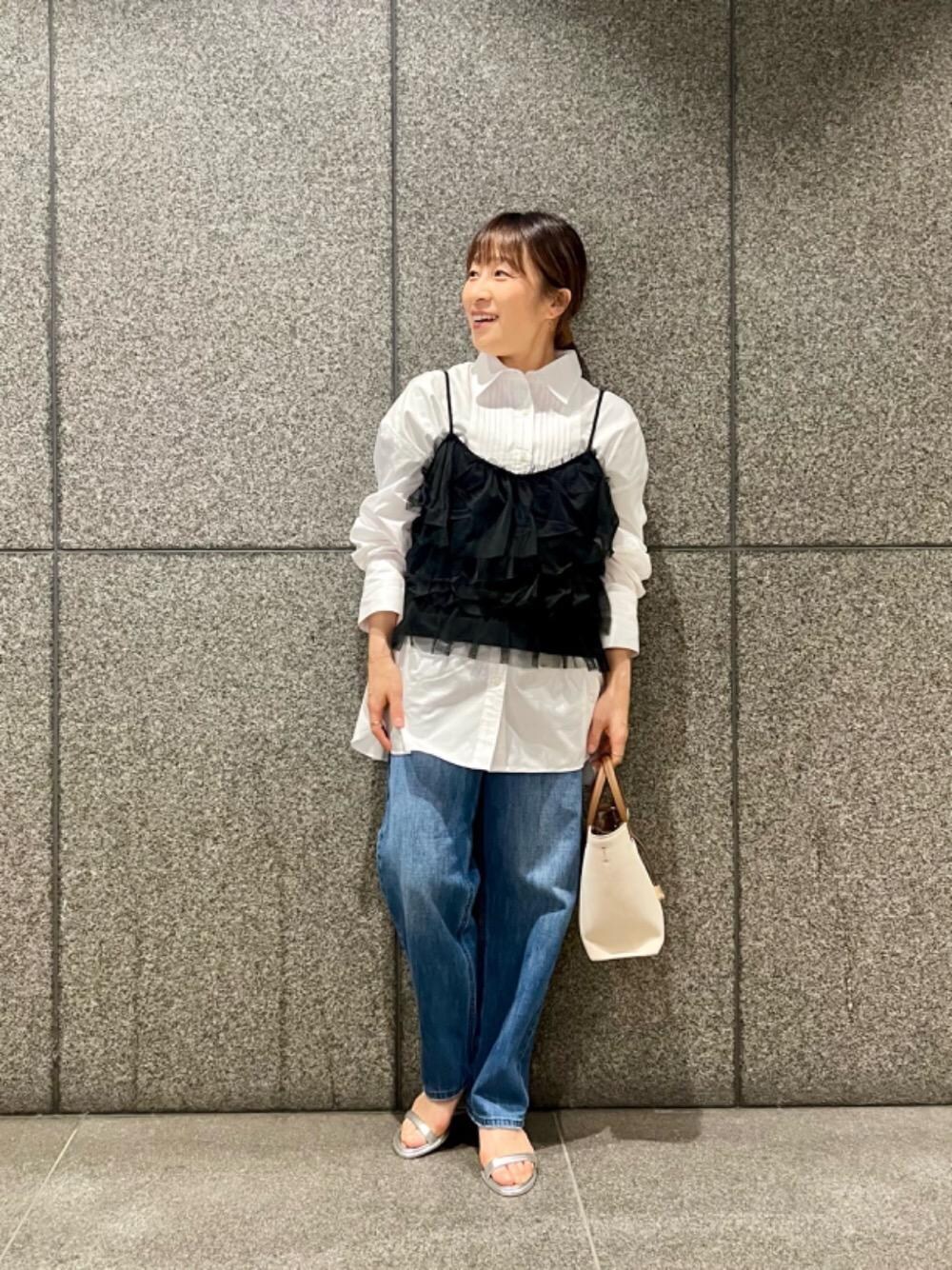 40代/152cm/骨格ストレート/普段サイズ36〜38/着用サイズ38 【TORRAZZO DONNA メッシュフリルキャミ】 サイズ感:身頃はゆとりあり、着丈はアジャスターで調整可能です。 素材感: ふわっとしたシフォン素材で、厚手過ぎない生地感です。 着用感:インナーにロンTやゆったりめなシャツ合わせもオススメです。 【フロントピンタックオーバーレギュラーシャツ】 サイズ感:ゆったりしていて、ヒップラインしっかり隠れる着丈です。 素材感: ややハリのある柔らかい生地感です。 着用感:1枚で着てもシンプルになり過ぎない万能アイテムです。 【デニムソフトテーパードパンツ】 サイズ感:太ももとヒップがジャストなサイズ感です。 素材感: ソフトな素材感なので、動きにくさはありません。 着用感:テーパードのシルエットなので、オーバーサイズやレイヤードにも相性抜群です。