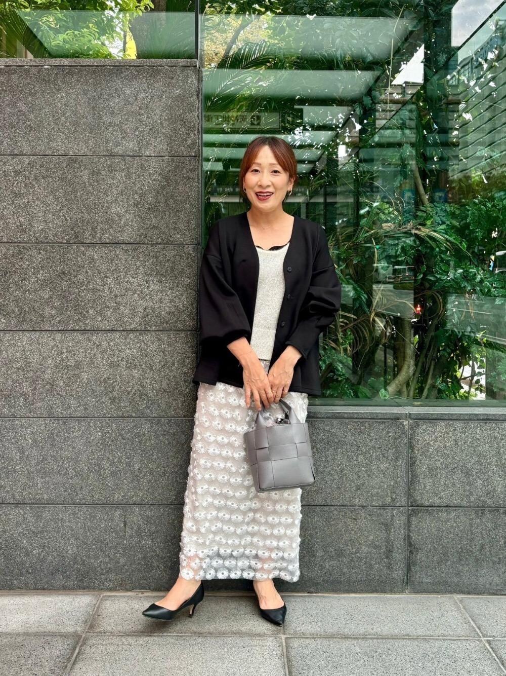 40代/151cm/骨格ストレート/普段サイズ36〜38/着用サイズ38 【ダルボールノーカラージャケット】 サイズ感:ほんのり広がりがあるフレアシルエットで程よいゆとりがあります。 素材感: 滑らかな手触りで、柔らかい素材となっております。 着用感: 伸縮性のある生地で窮屈感なく着用できます。袖口のタックがたくし上げた時にボリュームのあるシルエットになる所がポイントです。 【シアーモチーフレーススカート】 サイズ感:ウエストがゴムと紐仕様なのでややゆとりがあります。 素材感: 表面は凹凸感がありますが、裏地はとろみのある柔らかい素材です。 着用感:裾にスリットがしっかり入っているので足捌きも問題ないです。