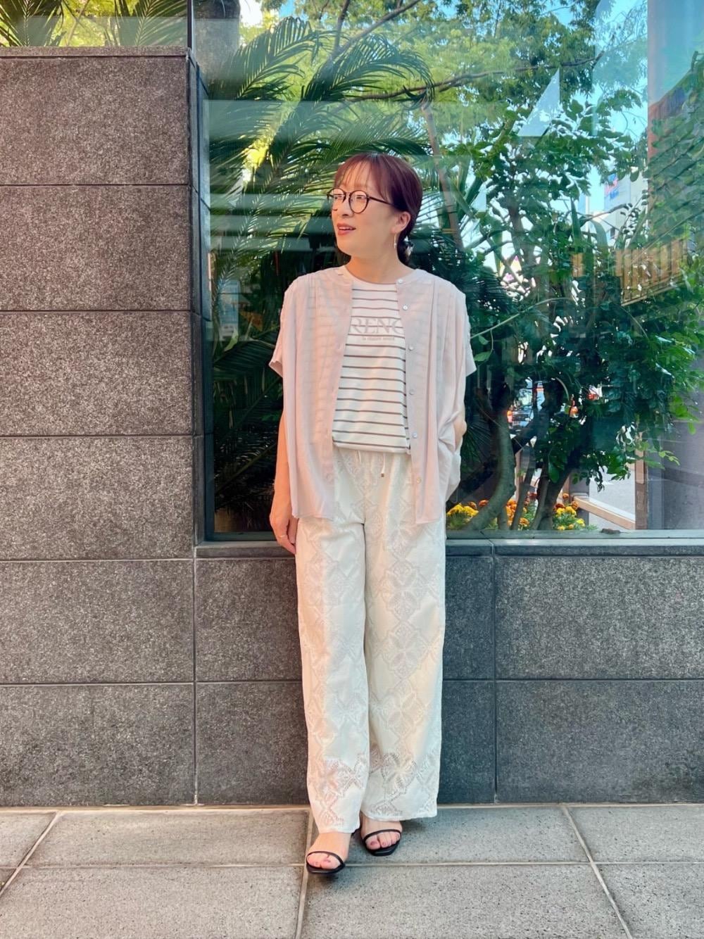 40代/151cm/骨格ウェーブ/普段サイズ36〜38/着用サイズ38 【シアーバックフリルギャザーブラウス】 サイズ感:ゆったりとしたサイズ感。 素材感:軽くて柔らかい素材感です。 着用感:シアー素材が涼しく快適な着心地です。 【ロゴボーダーフレンチスリーブカットソー】 サイズ感:ゆったりとしたサイズ感。 素材感:サラッとした生地で、着心地が良いです。 着用感:首周りも開きすぎず、1枚着としてこれからの時期にマストなアイテムです。 【カットワークレースパンツ】 サイズ感:ゆったりとしたサイズ感。 素材感:軽くて柔らかい素材感です。 着用感:シアー素材が涼しく快適な着心地です。