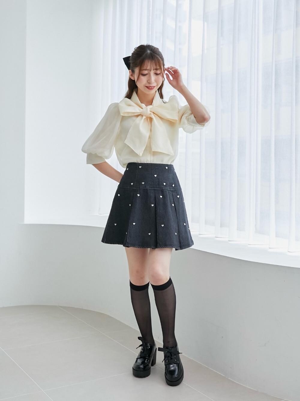 身長153cm/Mサイズ着用 王道モノトーンガーリーコーデ🤍🖤 1枚で華やかさが出るボウタイブラウスは大きなリボンが今年っぽくコーデのアクセントに✨️