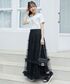 身長153cm/Sサイズ着用 モノトーンフェミニン🤍🖤 今季トレンドのリボン🎀がポイントのTシャツは1枚でこなれ感が出るアイテムです✨️ ボリューム感のあるチュールスカートは一気にフェミニンさが増してシンプルなトップスとも合わせやすい👍
