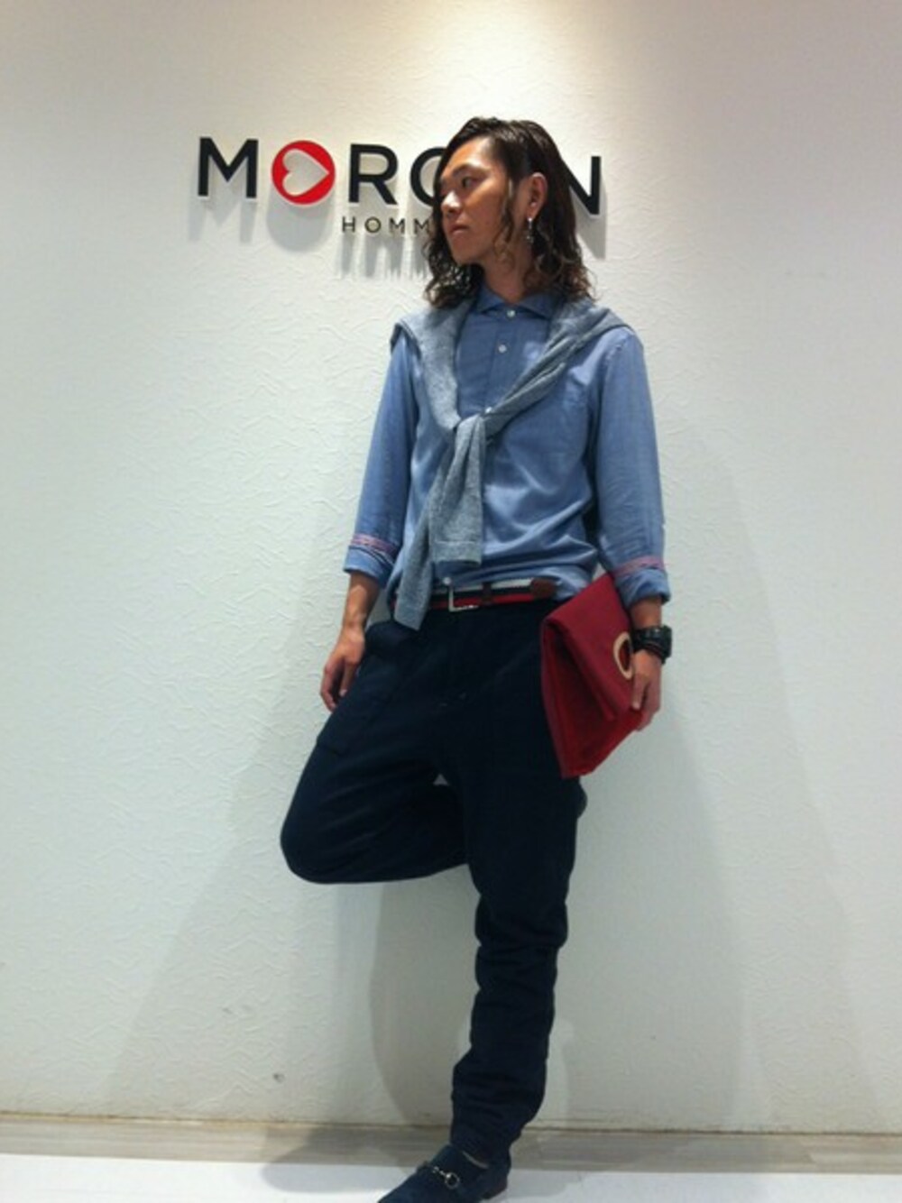 大人のルーズスタイリング。 落ち着いたブルーのワントーンコーディネートに、アクセントとして色物をチョイス。