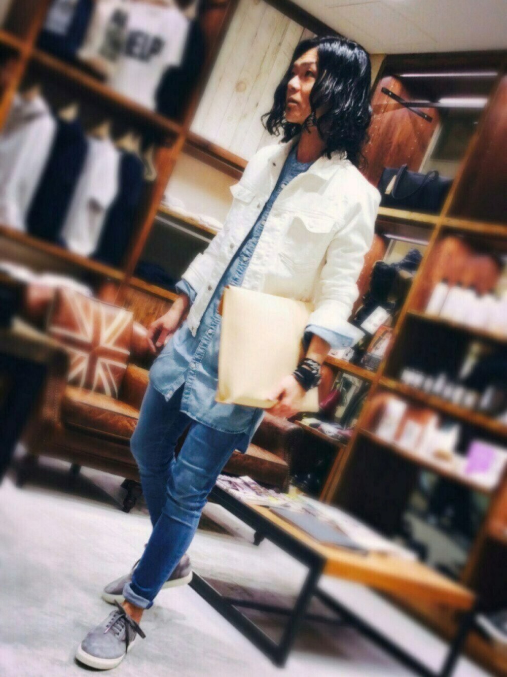 KIKURINE HAMNETTのお時間です♬ 爽やかのさの字も無いのに(笑) ブルーデニムが映える春らしさを意識したコーディネートです♬ ちょっと遊びを効かせてロングシャツとのレイヤードスタイルです。 縦長のスタイリングでカジュアルでもスタイリッシュに^ ^ ☆ブルゾン ストレッチ抜群のGジャンです。 この時季ならではの白アウターは必見です! ☆シャツ ノーカラーシャツ、ロング丈、オーバーサイズはトレンドですが、こちらはタイトなシルエットでスタイリッシュに着れるシャツです! ☆パンツ 非常にラインのキレイなスキニーパンツです。 レングスも少し短めなので、これからの季節のロールアップスタイルにもオススメです! ☆シューズ スエード調のスニーカーです。 カジュアルの中に大人っぽさのあるモデルです。 ☆バッグ 瀬戸内海の因島で職人参考の手により1点1点丁寧に手作りされた鞄です。 何より品質の良さが実感出来るMADE IN JAPANのクラッチバッグです!
