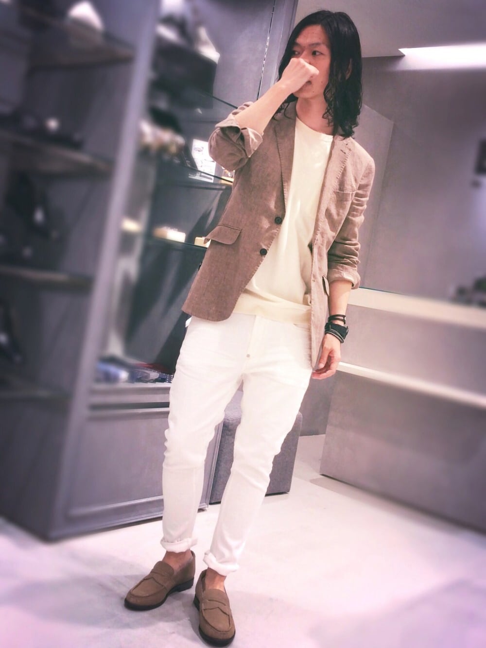 KIKURINE HAMNETTのお時間です♬ 今回は私オススメのナチュラルトーンコーデのご紹介です! 大人になったら一度は着てみたい色、ブラウン・ベージュをホワイトデニムで上品なカジュアルに仕上げてみました^ ^ ☆ジャケット 麻100%の涼しいジャケットです。 洗いをかけた非常に柔らかく着やすいので是非一度着ていただきたいです! ☆カットソー オーガニック100%にこだわったカットソーです。 肌触り柔らかく着やすいです! ☆パンツ 非常にラインのキレイなスキニーパンツです。 レングスも少し短めなので、これからの季節のロールアップスタイルにもオススメです! ☆シューズ スエード素材のローファーです。 とにかく柔らかく履きやすい! 履き始めの靴づれもおきません^ ^