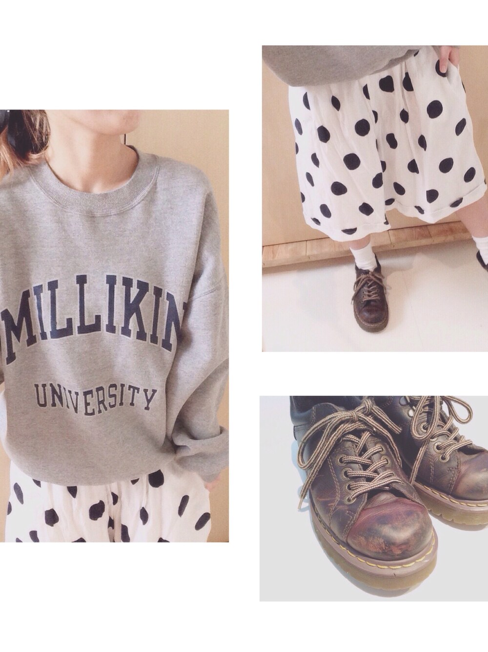全身古着の日 🍡 でっかい水玉のガウチョパンツ めっちゃ気に入ってます〜〜〜❤︎かわええ 足元は、安定のマーチンさん 。
