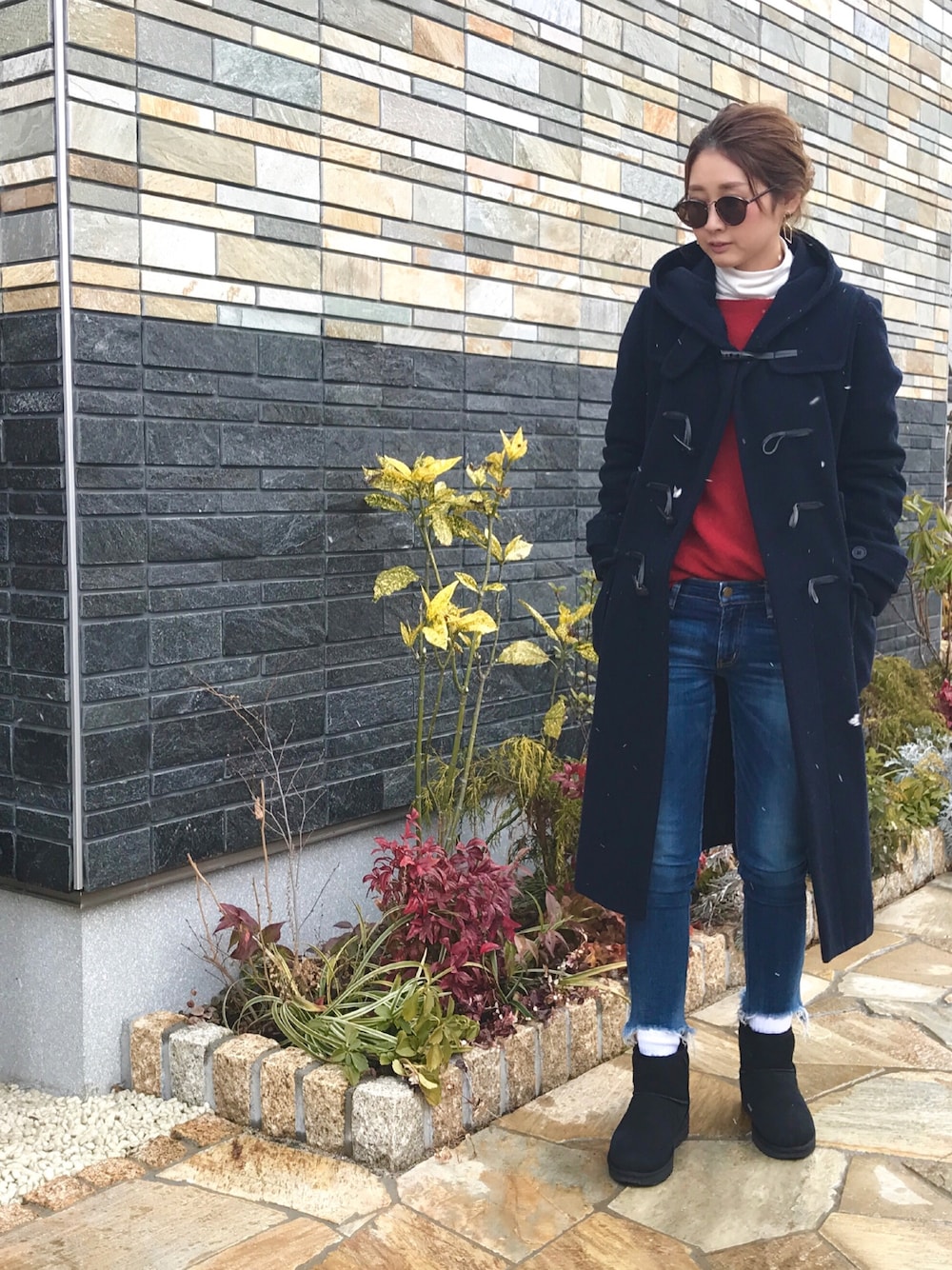 雪が降る中❄️ こんな日はUGGが1番。 完全防寒コーデ♡ 赤ニットにネイビーのダッフルが 結構好き♡