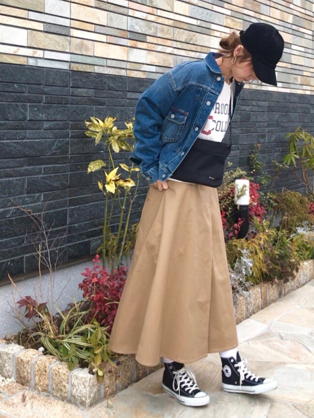 チノスカート、Gジャン、サコッシュ GUコーデ♡ このスウェットのリメイク めっちゃ可愛いんよな〜♡ 見てほしい🤭