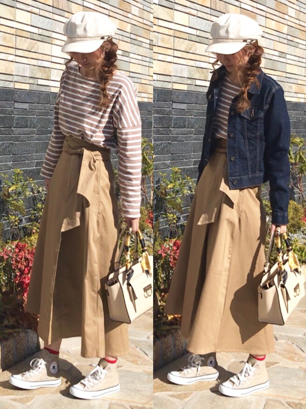 今日はかなりガーリーに🤭 ベージュのワントーン ベーコン👟再販getできた♡ Gジャンはインディゴで