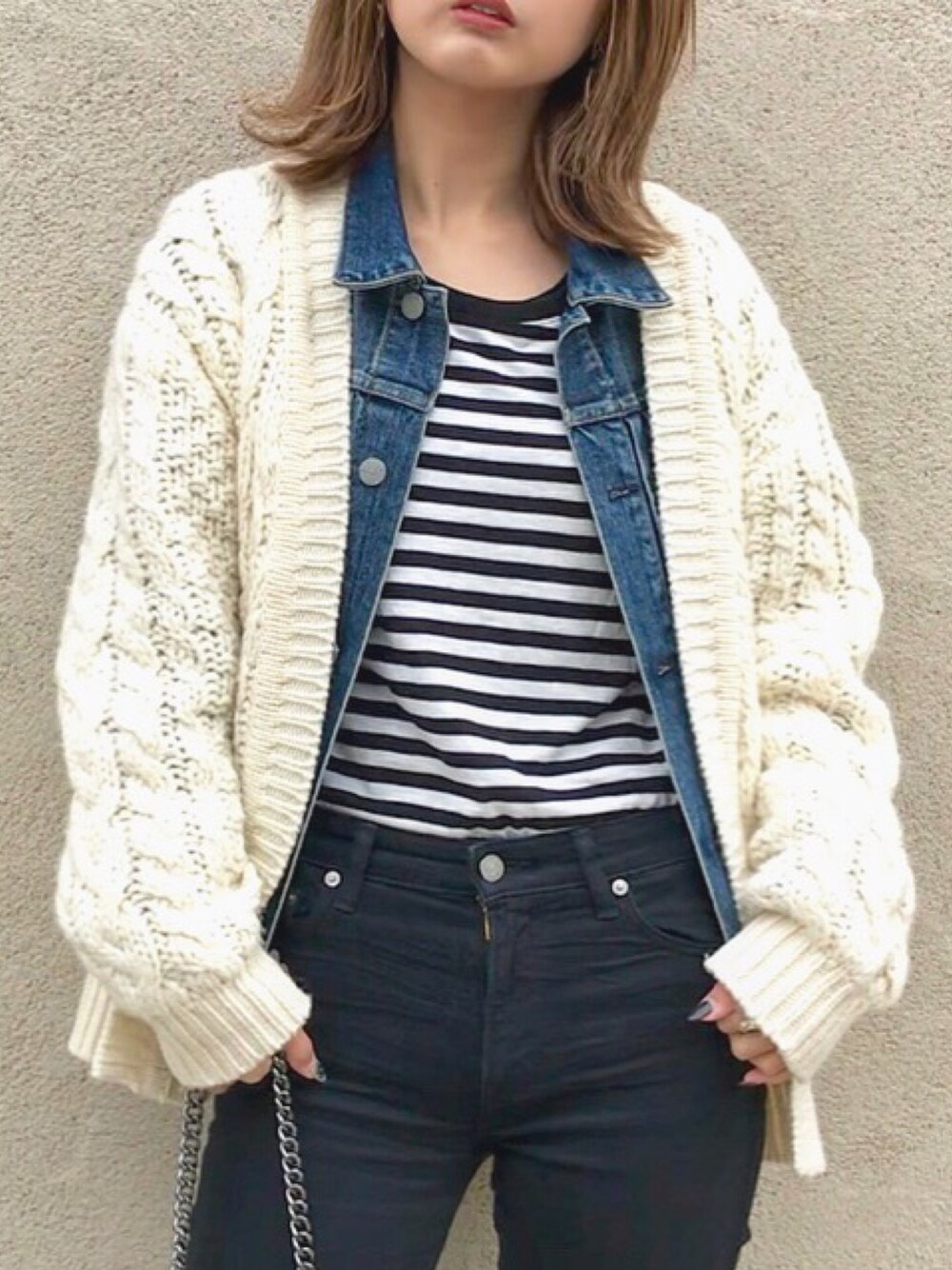 Gジャンとカーディガンの レイヤードスタイル♡ インスタ☞@c__tm