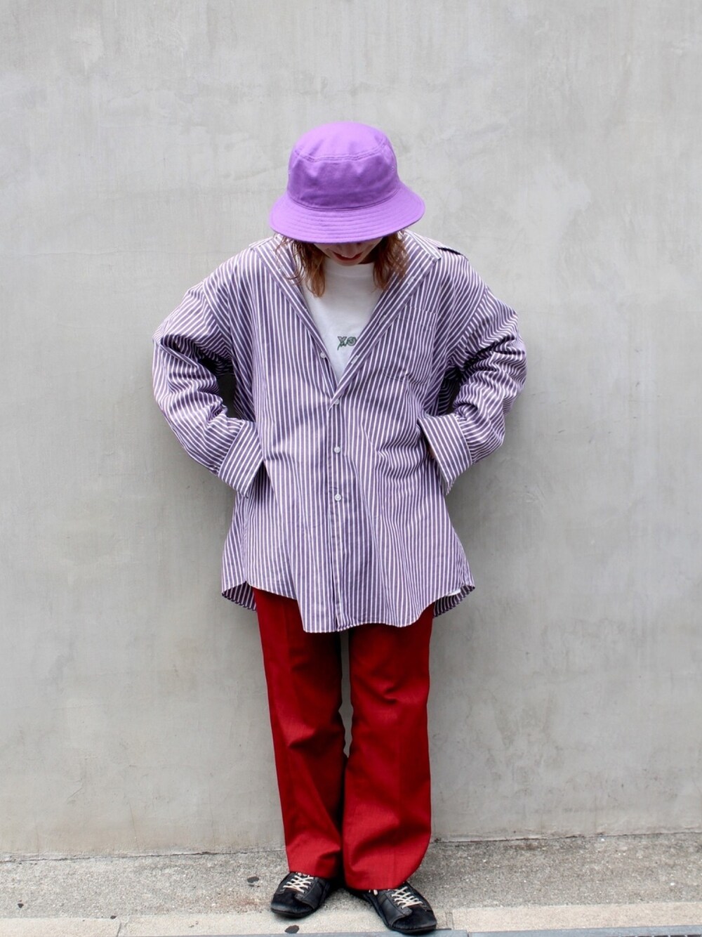 帽子☞シンプルなバケットハット🍇どんなコーデにも馴染みやすく、カラーものはポイント使いにおすすめ!今回はパープルのシャツと合わせて✌️ Instagram☞or_chr_