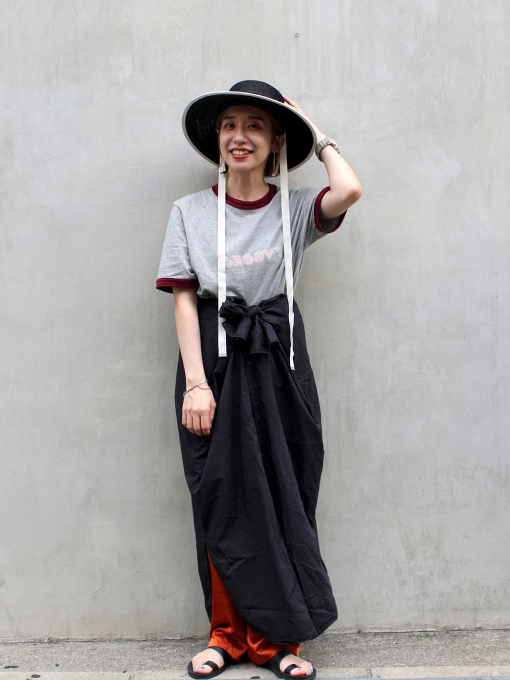帽子☞最近1番被っているハット👒紐付きで今年らしいデザイン!垂らしても、首下でリボンにしても🙆♂️ コーデはシャツワンピースを腰巻きしてスカート風に✨チラッと見えるカラーパンツがポイントです! Instagram☞or_chr_