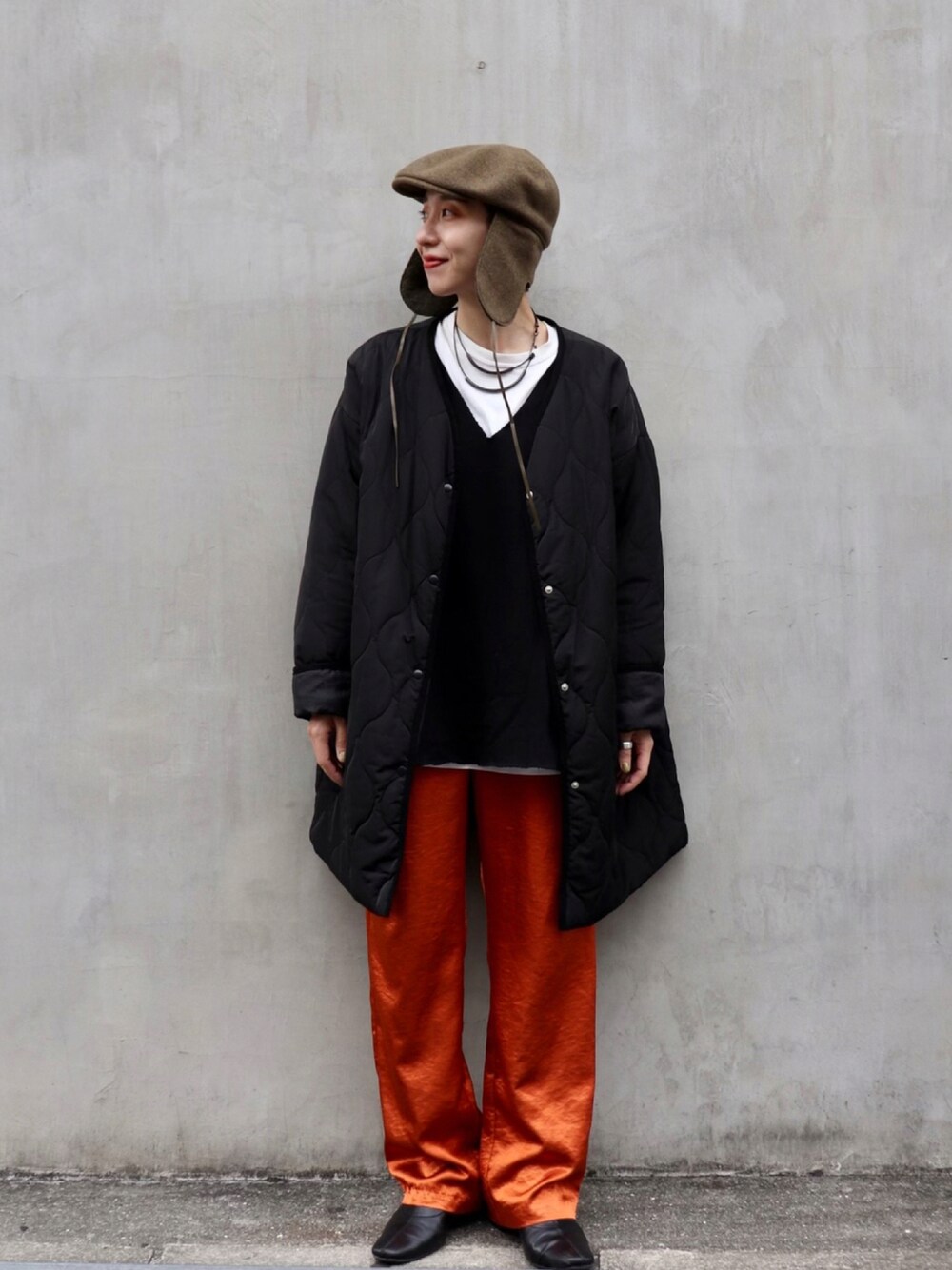 耳つきのハンチング👆寒くなってきて耳付き帽子はこの冬手放せません❄️❄️ オレンジカラー🍊のサテンパンツにVネックのニットを合わせて、カジュアルになりすぎないスタイリングを意識しました☀️ Instagram☞or_chr_