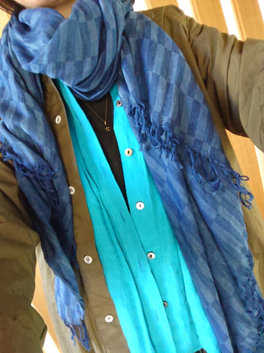 シャツワンピースは羽織にできて便利✨ 播州織のストールはほんとに柔らかい! 春先に大活躍しています ロングネックレスは中村なづきさんの
