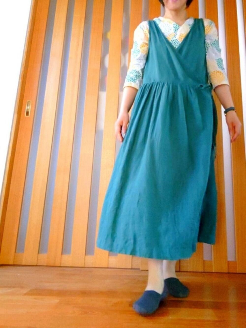 リネンのカシュクールワンピース、 買ったのは3年前かな? やっぱり初夏に着たい組み合わせ sou·souの抜衿ジバン七分丈 後ろも浅くVネックになってる 菊づくしはどの色のパターンも欲しくなってしまい。各アイテム、各色かぶらないように集めてます!