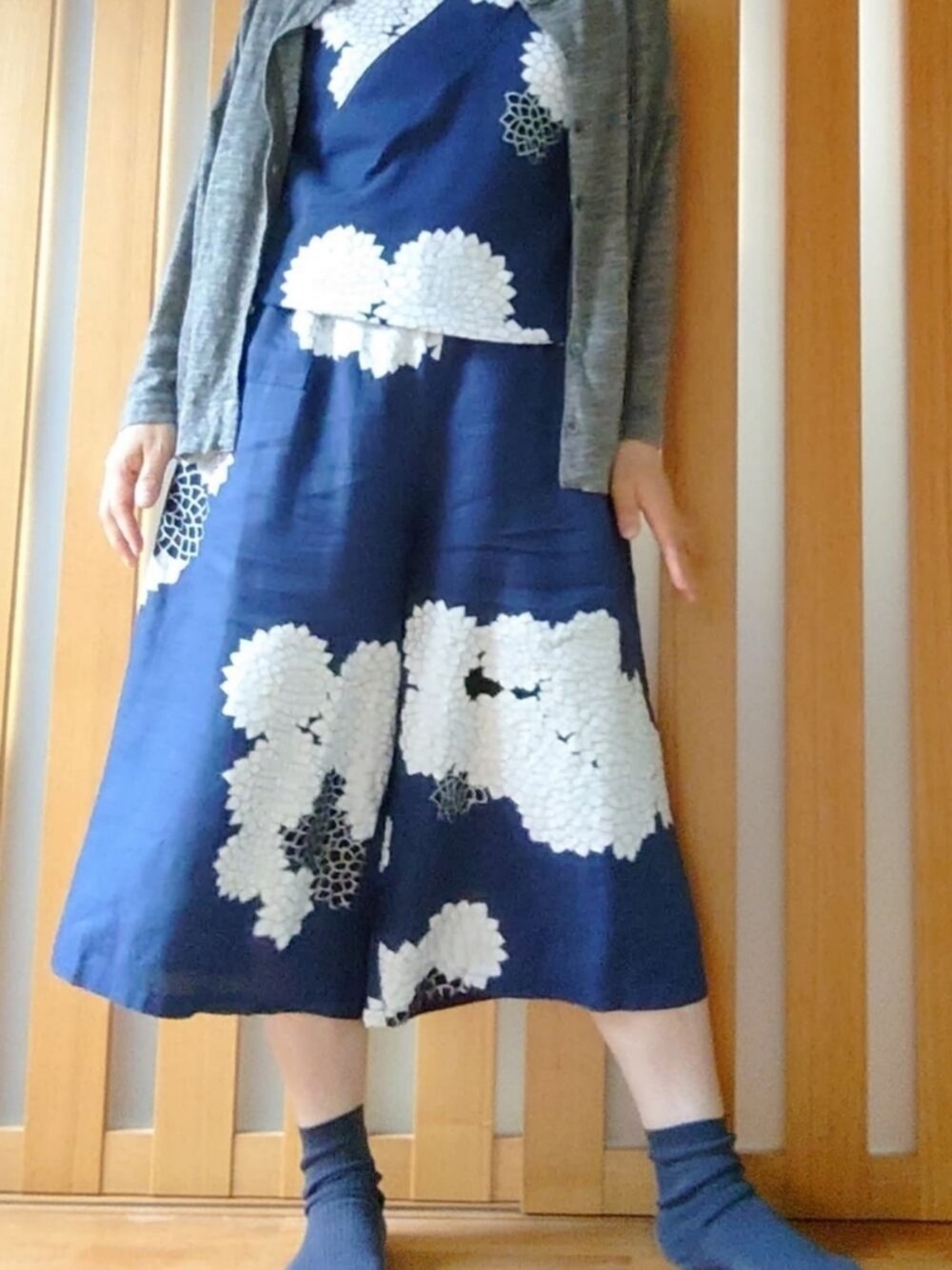 抜衿ジバンは高島縮、 広形もんぺは麻 素材ちがうけどセットアップで着てみました どちらも厳しい残暑に快適✨ 菊づくし、もいいけど 雲間に菊、も好きです♪ 靴下はリネンと同じくらい快適なささ和紙 夫婦とも愛用、 穴があくまではいて あいたら靴の中に丸めて入れる! 消臭効果ありだそうです♪