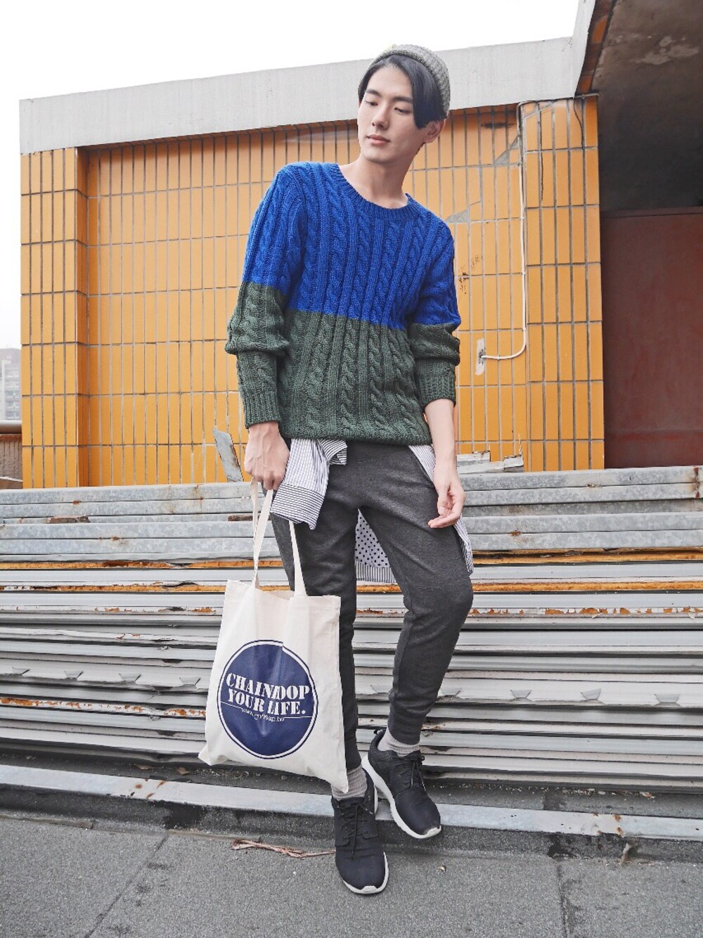 毛帽:DeMarcoLAB 雙色毛衣:DeMarcoLAB 立體口袋棉褲:Chainloop 托特袋:Chainloop 鞋:Nike