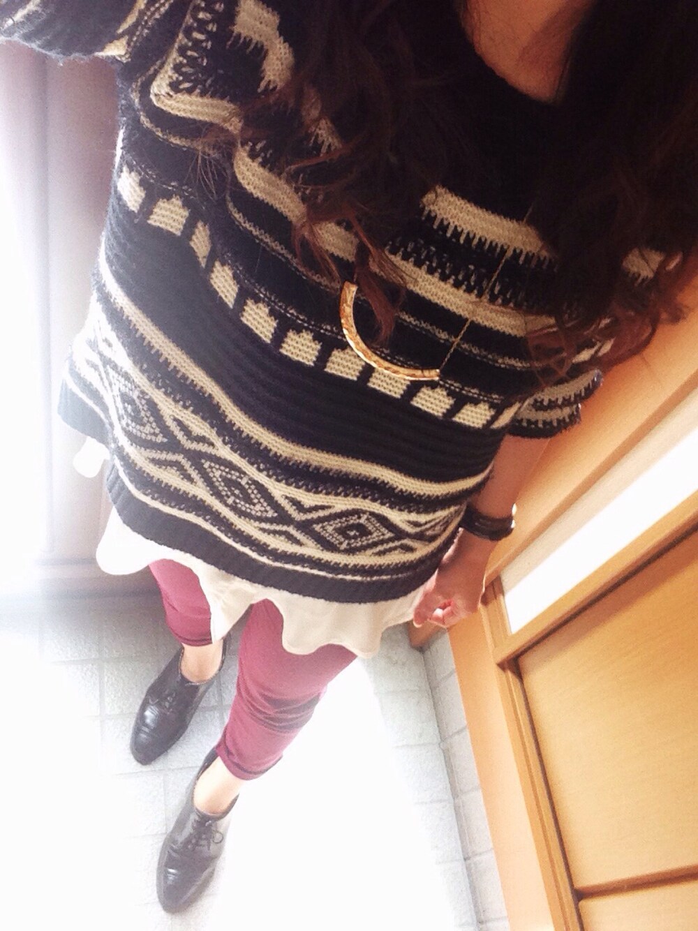出勤コーデ🎩💕 ボルドーのカラーパンツに ジャガードニット合わせました😊 パンツ以外はブラックにして、 派手すぎずに、、😌💭 いつもモノトーン系が多いので かなり新鮮でした👯💓 このパンツ本当にストレッチが 効いていて、柔らかくて 凄く履きやすいです🙆💕 値段も3,000円と手が出しやすいので 人気ですよ〜🙌💓💓 是非履いてみて欲しいです👏💕 ※ネックレスが曲がってるのは スルーでお願いします😂😂😂笑 いつもイイネやSAVE、 ありがとうございます🙏💓 時間あるときになっちゃいますが、 お返し行きます🙋🎵 フォロー、イイネ、SAVE、 何でも大歓迎なので 宜しくお願いします🙇💕