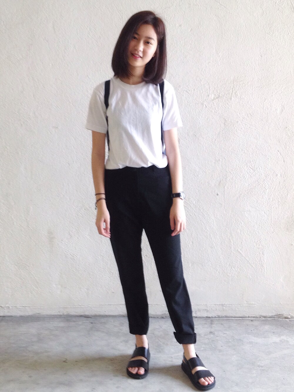 ブラック系のシューズ、ホワイト系のTシャツ/カットソーを着用したレディースの春コーディネートの1枚目の写真