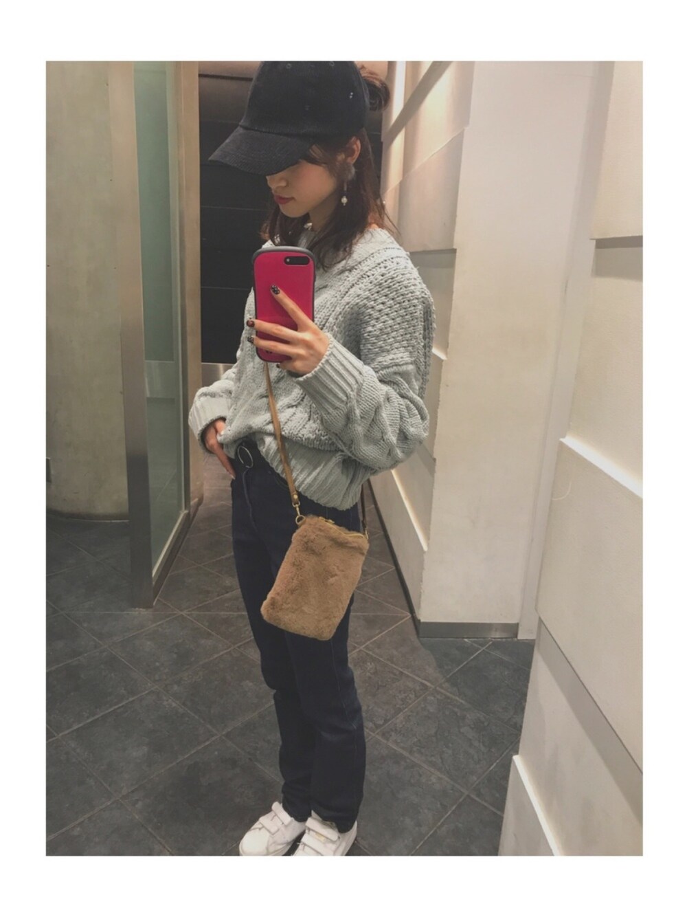 off code☁️🌈 去年買ったざっくりニットに デニム👖スタンスミス👟 もこもこ小物をふんだんに〜💛 ネイルまつエクショッピング赤から🍲 いい休日でした😋