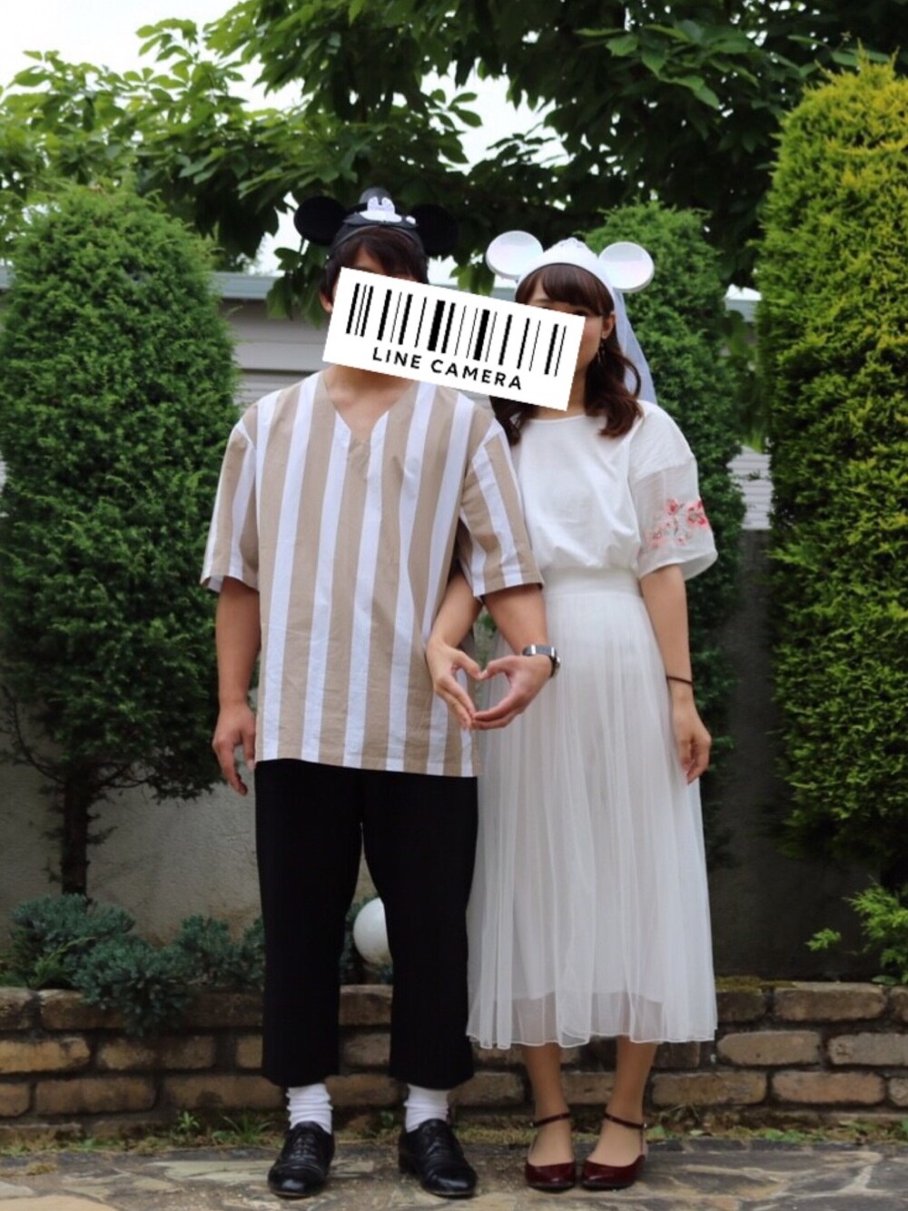 お土産にミッキーとミニーのイヤーハットをもらいました 結婚式で使えたらいいね って2人で写真を撮ってみました わたしはウェディングドレスっぽく 白を基調にしてみました 刺繍の色合いと合わせて靴は赤にしました❁︎ 旦那はトップスがお気に入りだそうです。笑 なにげに靴のメーカーがおそろいです