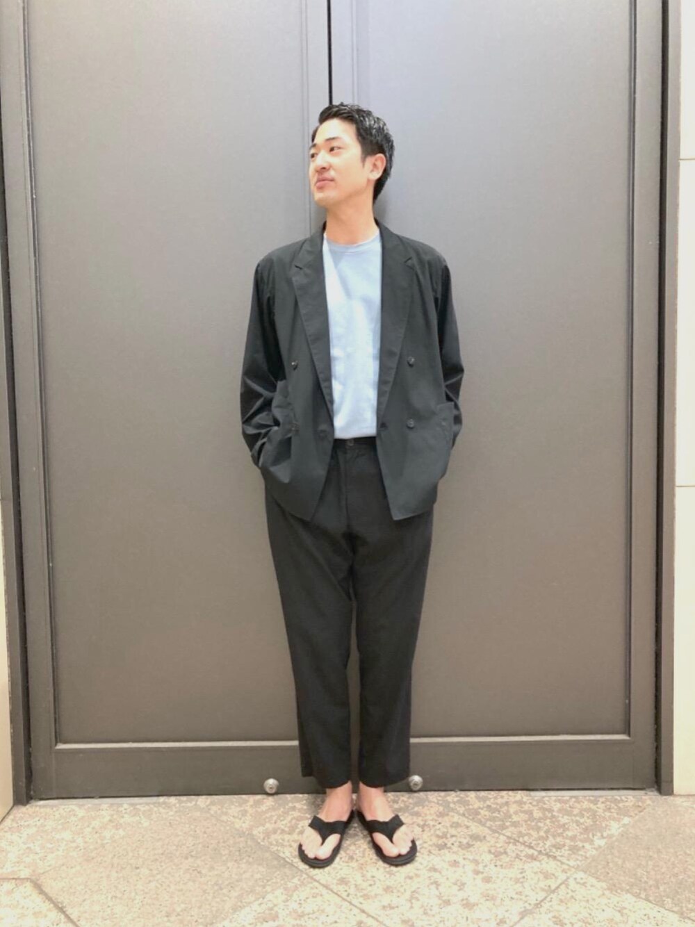 黒を基調に、暗くなりすぎないようTシャツで色を差しました。足元はアイランドスリッパで抜け感を出して軽快な印象に。