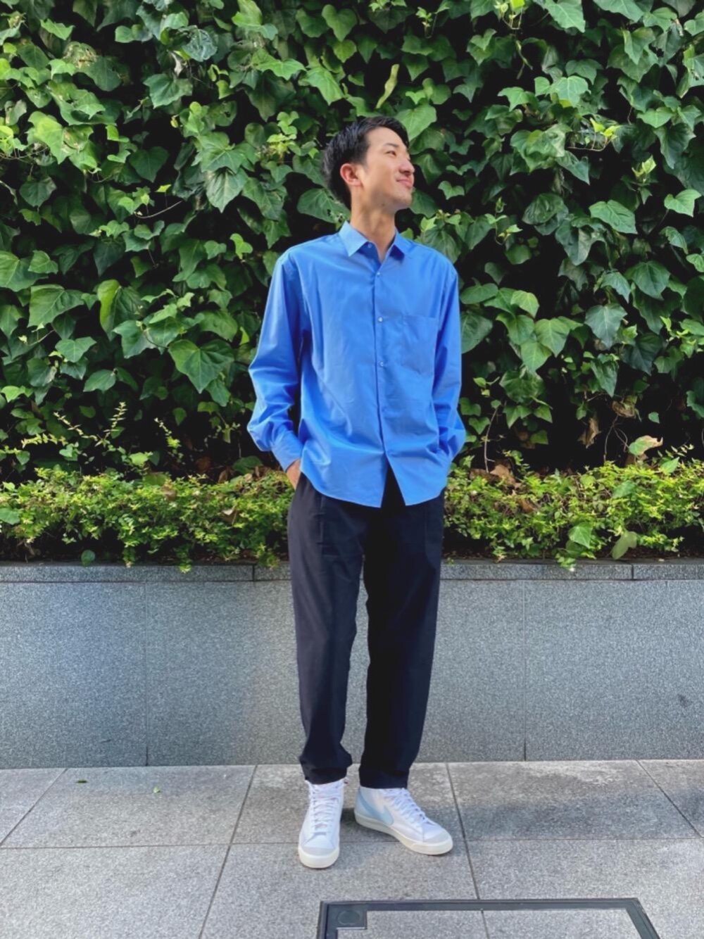 秋冬に向けたアイテムですが、色を青系で統一し、爽やかな晩夏のコーディネートに仕上げました。