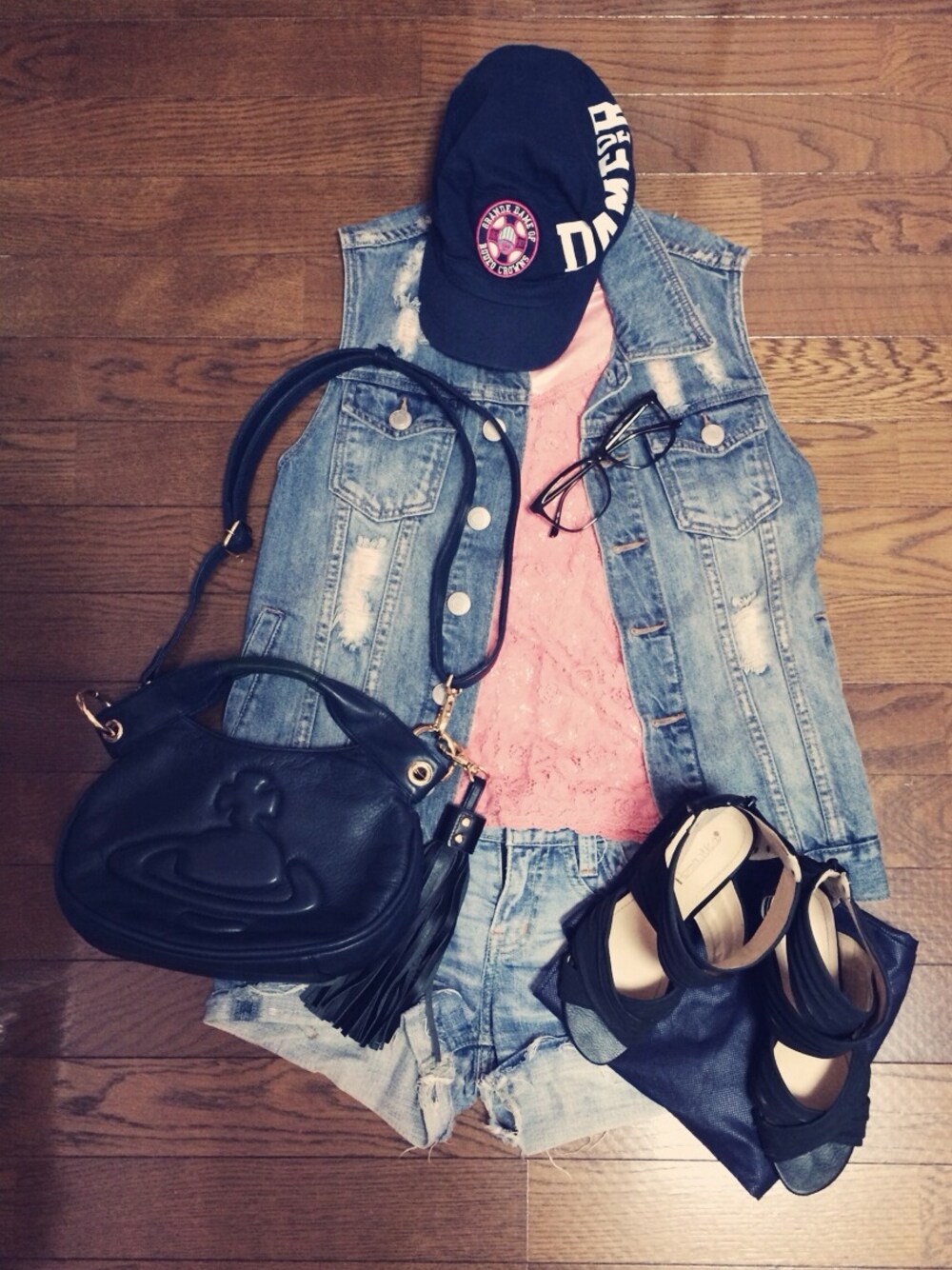 ピンクのレースタンクトップはそこらへんで買った安物ですが、色がすごくキレイで、着回し力もばつぐん♡ 足元はあえてスニーカーではなく、キレイめなサンダル♪☺︎