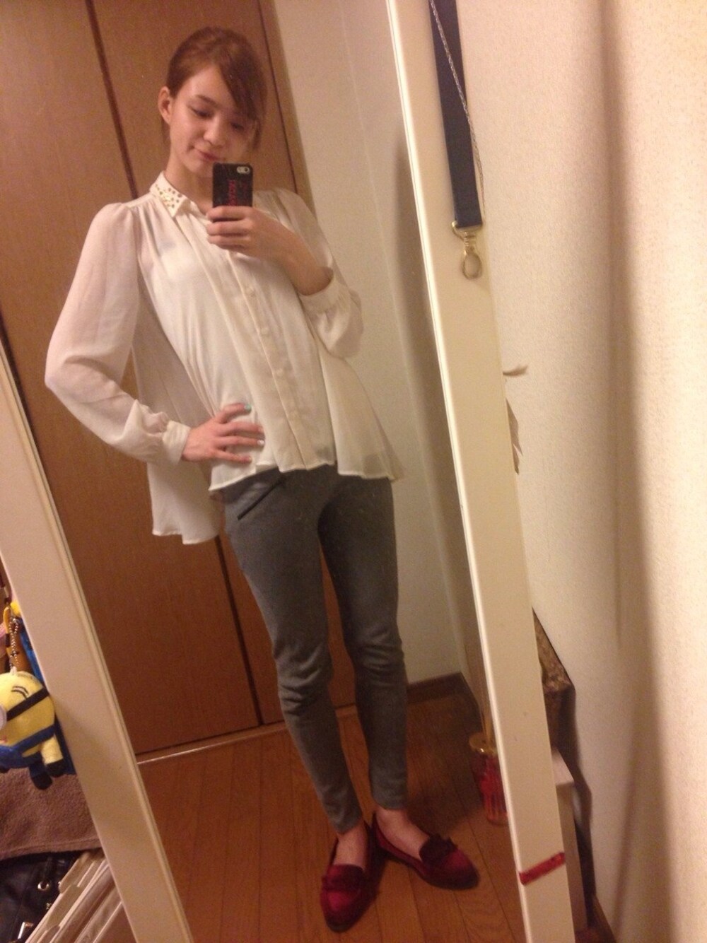 ホワイト系のシャツ/ブラウス、グレー系のその他パンツ、レッド系のその他シューズを着用したレディースの春コーディネートの1枚目の写真