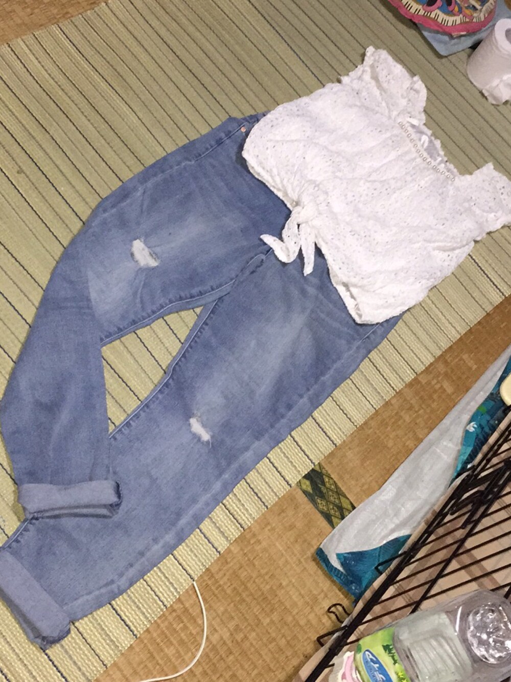 クラッシュスキニーデニム♡に夏らしく白を合わせて♡ ピタっとしたスキニーだけど、すごく伸縮性があってとてもいいよ♡ ヒール👠合わせたらかわいいかも♡