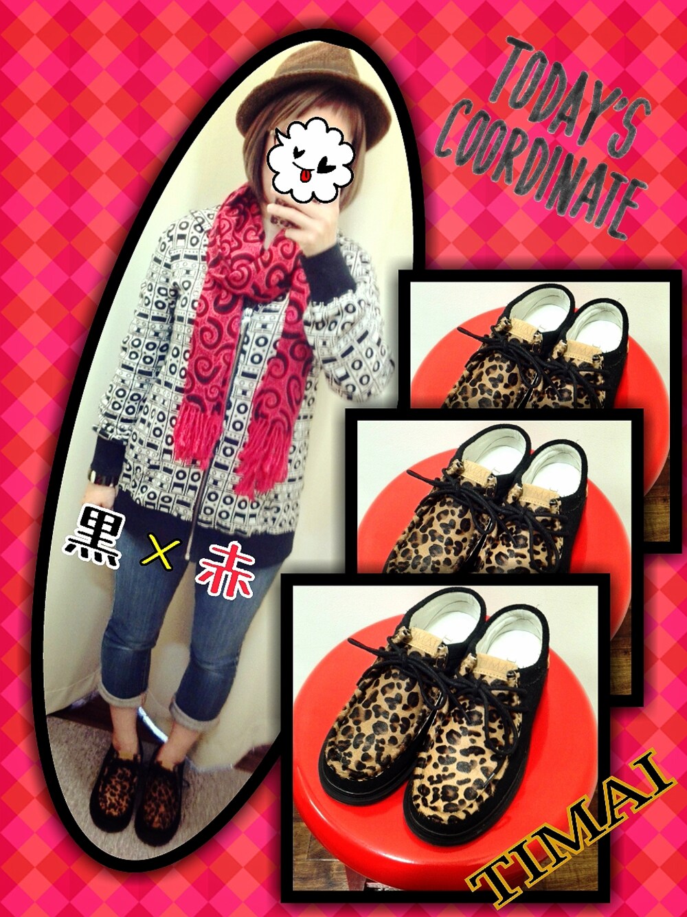 本日の出勤コーデ! たまたまピックアップタグにハマった?! でも、赤×黒ってより柄×柄www 昨日の勤務終了後、店長の『絶対お買得だよ!』のひとことで購入を決めたレオパードのTIMAI👟わら sale品でちょっと狙ってたけど、履いてみたら『やっぱり、かわいい』……で半額以下でGET♪ 大好きなIrieBerryの、スピーカー柄パーカーと合わせてみました!