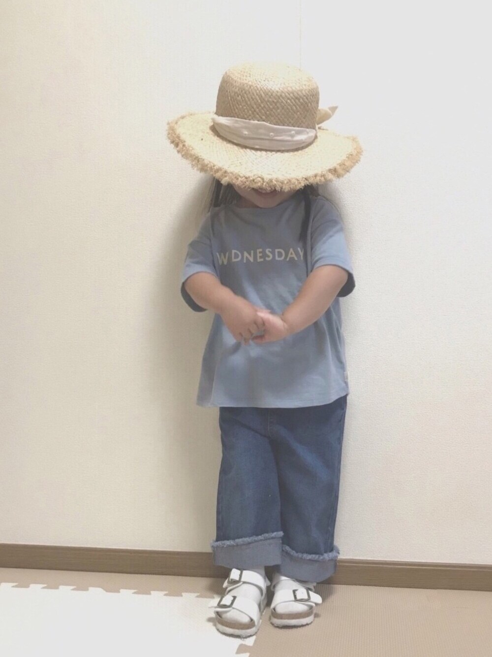 くすみブルーのロゴTシャツ 水曜日ver. バースデイで購入したラフィアハット フリンジでリボンもついてて クオリティ高い! 大人版欲しいなぁ…