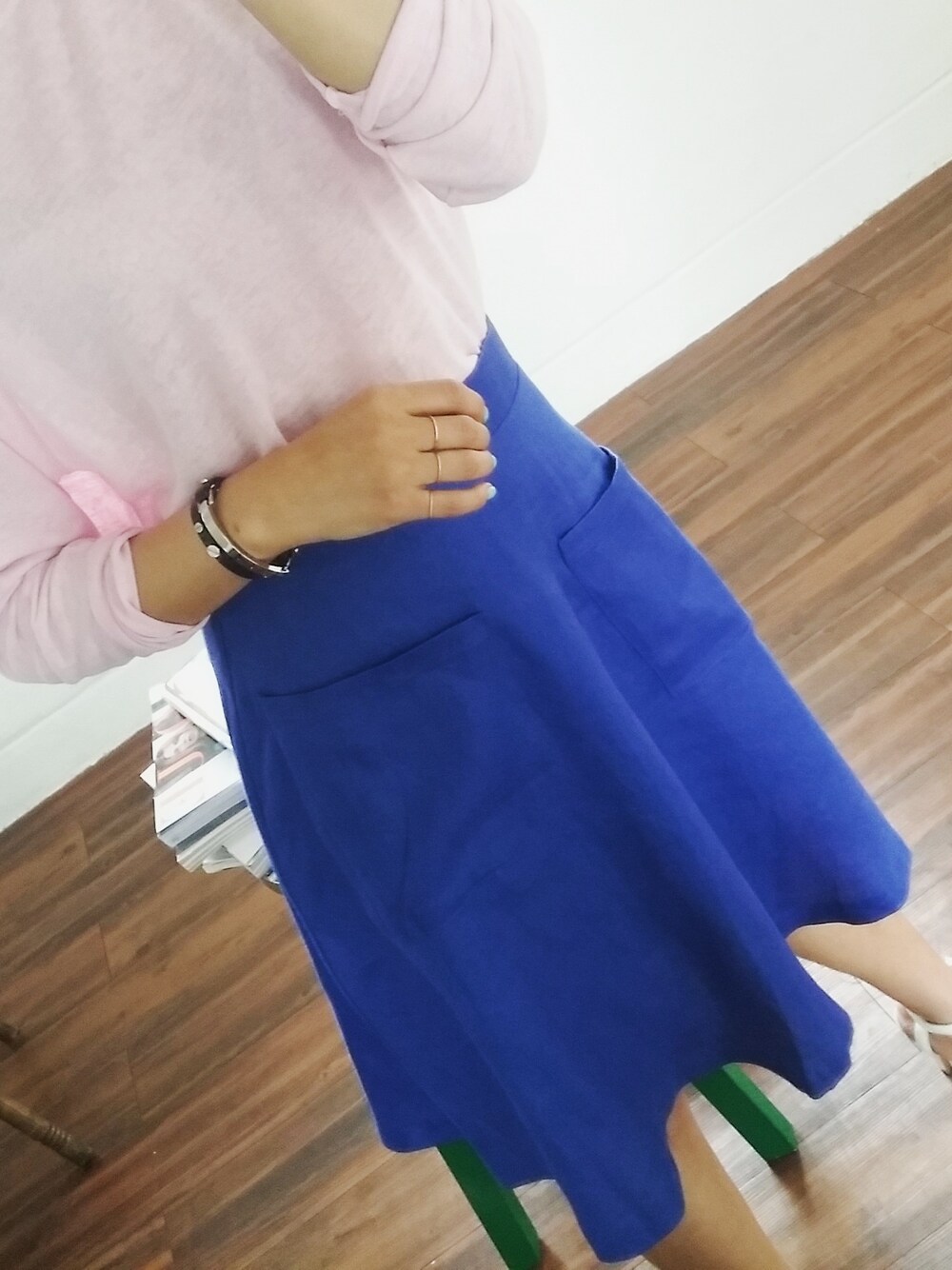 ブルー系のスカートを着用したレディースの夏コーディネートの1枚目の写真
