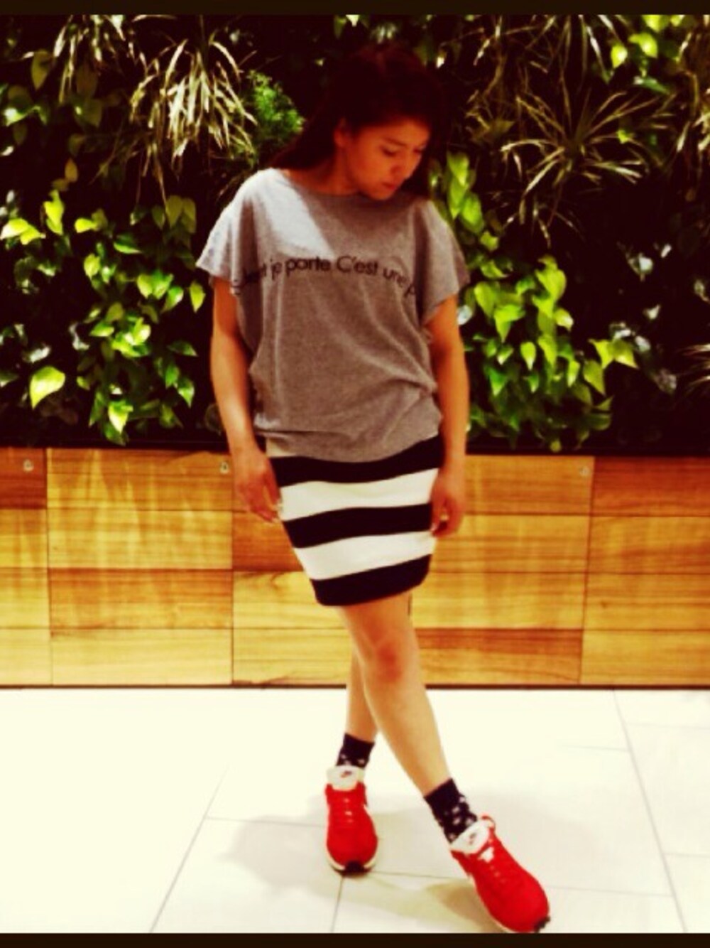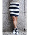 シンプルなアイテムをスカートのボーダーと、スニーカーの赤でまとめてみました。飽きなく着れるスタイル
