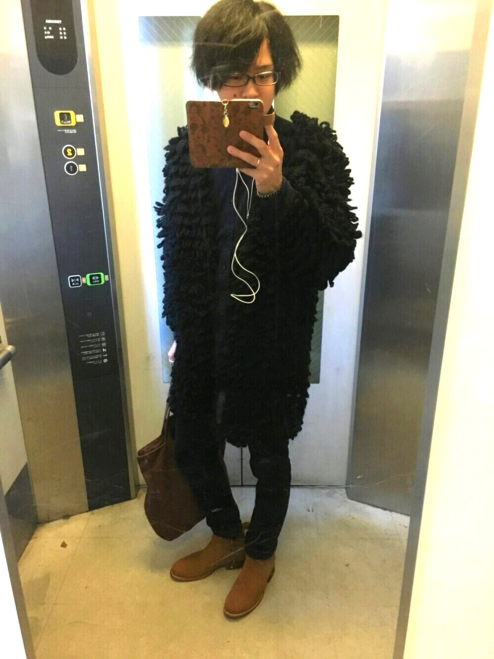 すごくいい感じのカーディガンを買いました! 大きめの糸の輪っかが特徴のループカーディガン! かなり厚地のニットのようになってるので暖かい。一目惚れで買ってしまった。 少し秋っぽく足元は明るくして全体は細く綺麗にまとめてます。 なかなか特徴的なのがすごく好きです。 別ショットはほぼ変わらないというね(笑)