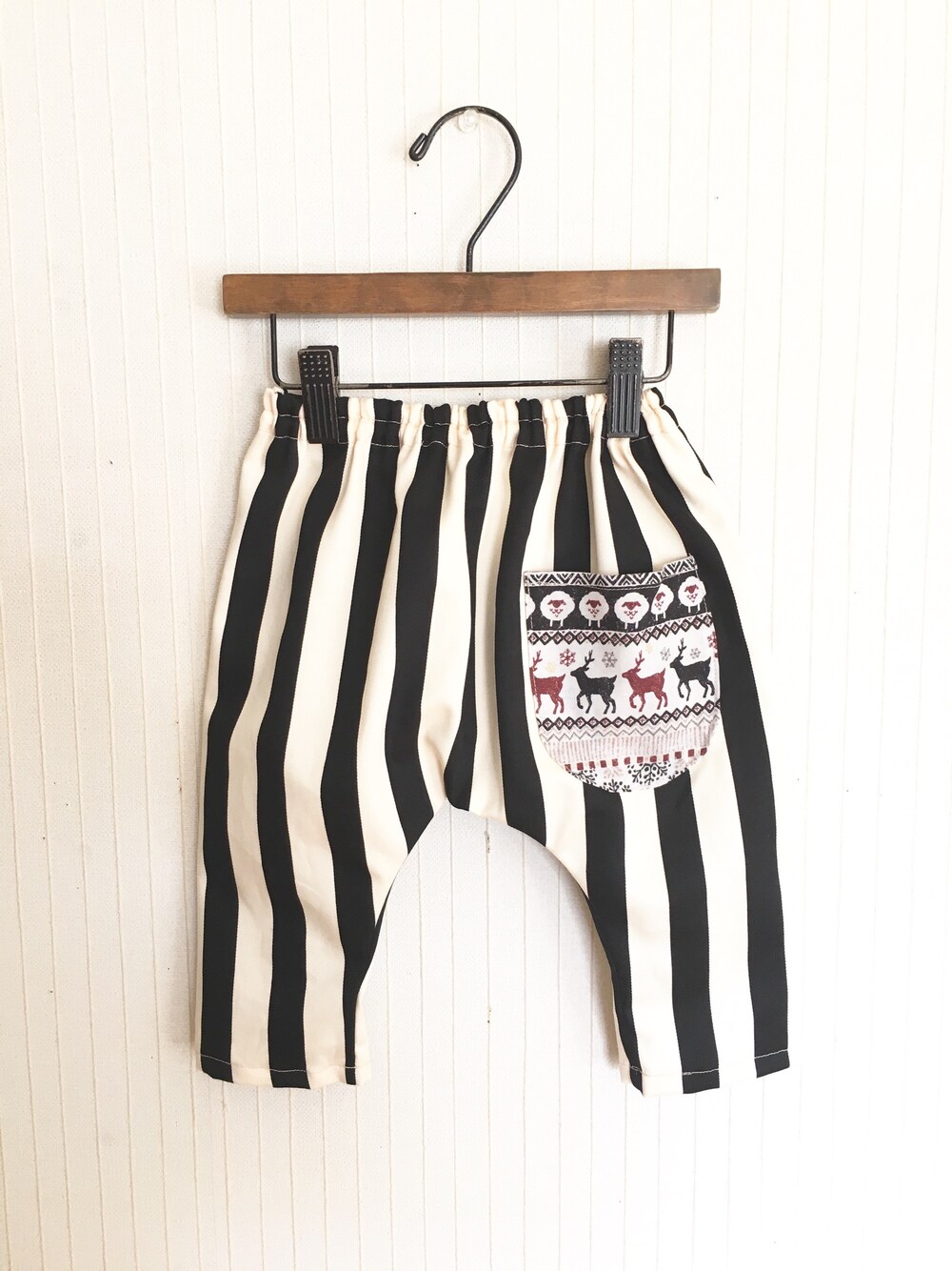 ✴︎minneで販売中✴︎ ブラック×ホワイトのストライプ模様の生地で作った、 シルエットすっきりサルエルパンツ。 ノルディック柄のバックポケット付。 オールシーズン着回せるコットン100%生地。 サイズ:ウエストゴム40cm~ 丈38cm 裾周り21cm UraraPatternさんの型紙で作りました。 型紙はこちらから購入出来ます↓ http://minne.com/items/922524