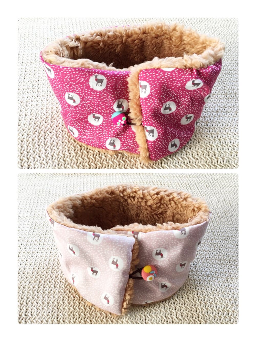 ✴︎minneで販売中✴︎ コットン100%の濃いピンク色と薄いピンク色の鹿さんイラスト生地とふわふわ気持ちいいプードルファーのネックウォーマー。 寒い時期のお出かけに♪ 手作りくるみボタン付き。 ベビーから大人まで使えるフリーサイズ。 (ボタンの位置を付け替えて微調整も可能です。) 親子でお揃いも可愛いです♫ サイズ:縦11×長さ51cmくらい